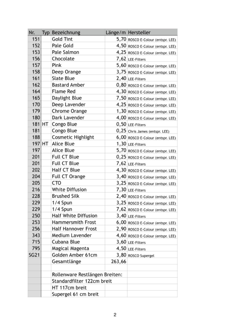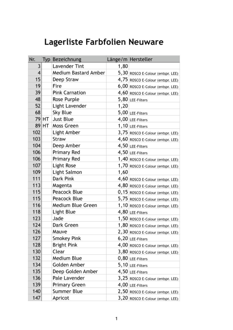 Verkauft werden verschiedene Restlängen Farbfilter auf Rolle, größtenteils LEE-Farben, einige ROSCO Supergel.