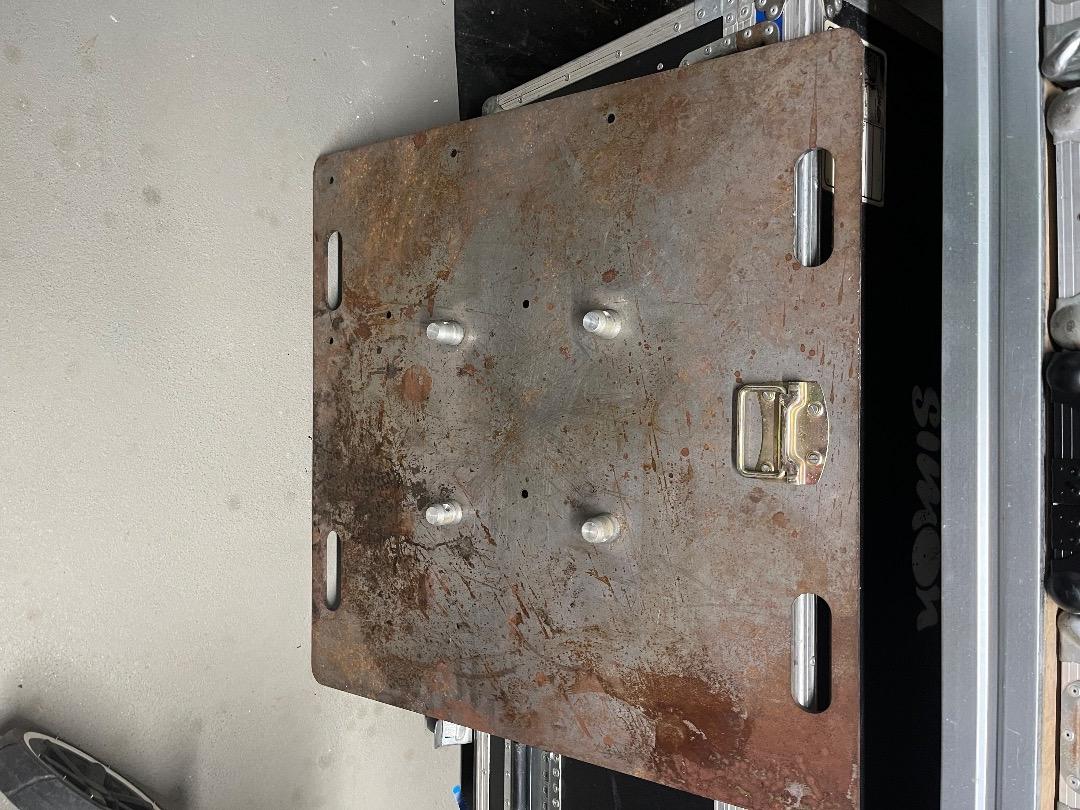 Hallo zu verkaufen stehen 2 Bodenplatten aus Stahl, die sind was am rosten da sie nicht Pulverbeschichtet sind. Die Platten haben Verschieden Bohrungen für unterschiedliche Traversen.