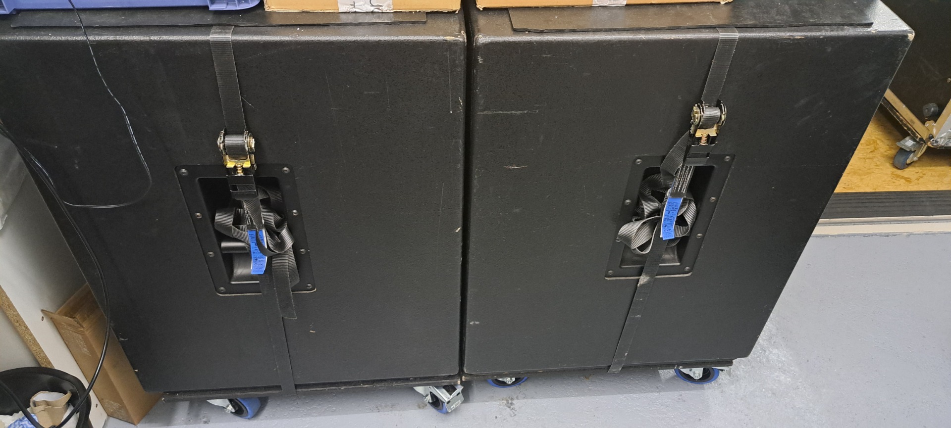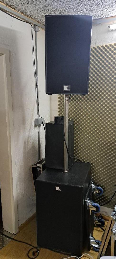 Dazu sind Flightcases für die Tops und Rollbretter für die Bässe, 2x Stativbügel (eigenbau, megastabil) sowie 4 MAN- Flugösen für die FH3r und Stativadapter für die FH3i vorhanden.