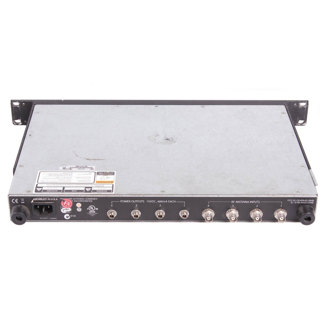 The Shure PA421SWB Antenna Combiner actively combines antenna outputs from up to four PSM wireless transmitters to a single antenna, improving RF performance and reducing rack clutter.
