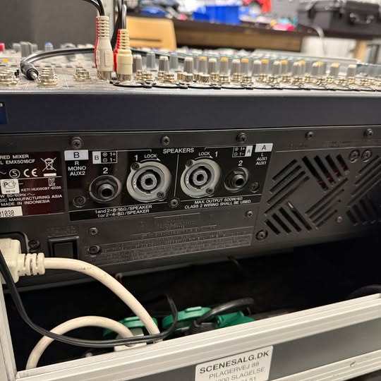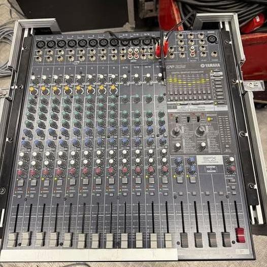Complete Yamaha EMX5016CF powered mixer setup including built-in player and sturdy flightcase for easy transport and protection.