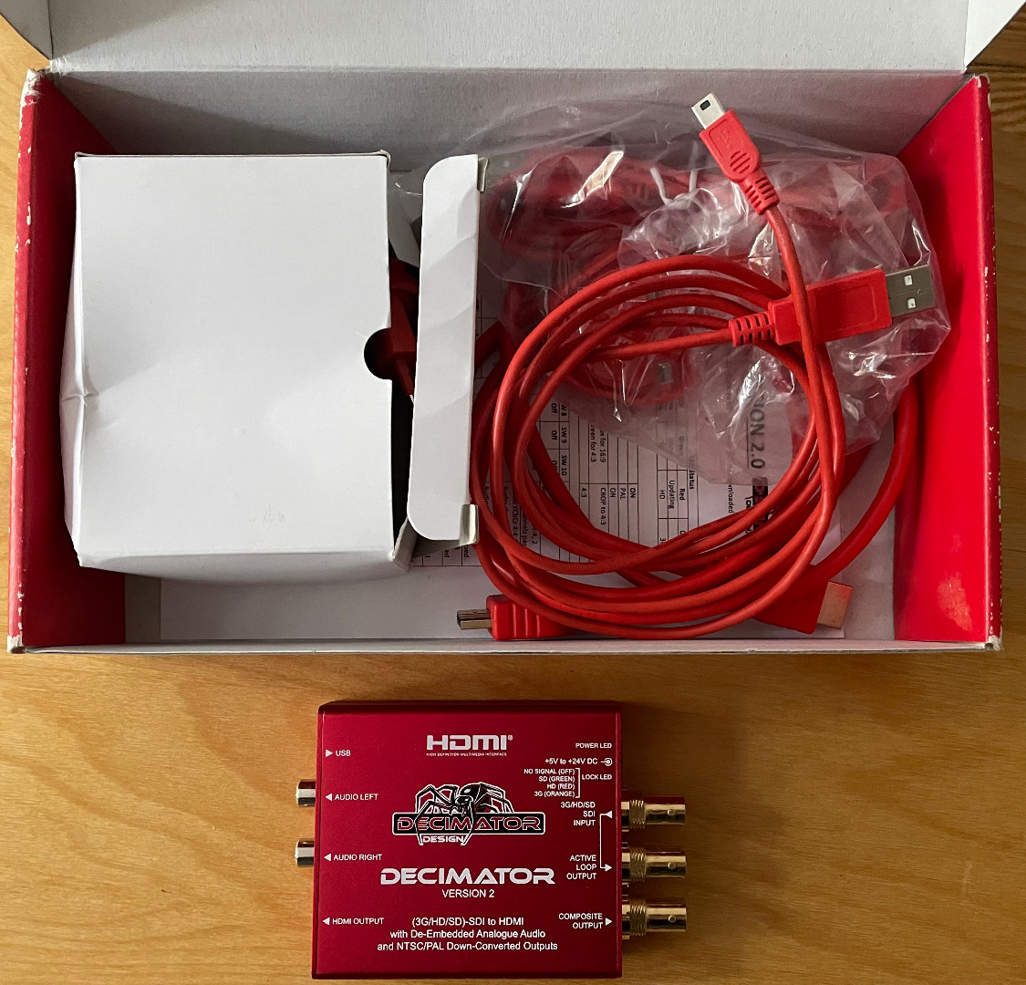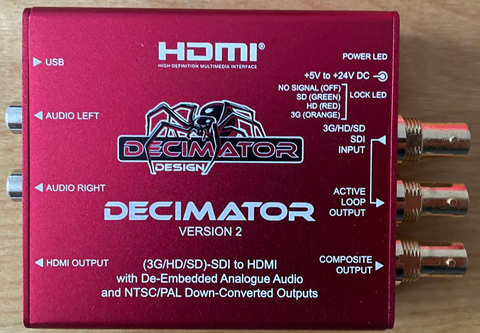 Verkaufe meinen Decimator 2 Videoconverter, SD-/HD-3G-SDI In, Loop Out, Composite Out, HDMI Out, Audio Out (RCA), Mini-USB Port für Konfiguration, alternativ über DIP-Switches, ext. Steckernetzteil.