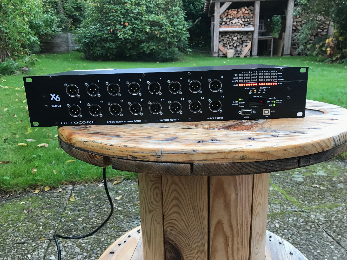 Verkaufe einen Optocore X6 16 Out 16CH AES- Line Out DA Converter, 19"/2HE, 24 Bit Auflösung, software-einstellbare Sampling Rate von 44,1, 48, 88,2 oder 96KHz über Windows Software Tool über USB, Einstellung der Ausgangspegel, internes oder externes Clocking (Wordclock I/O), vergoldete XLR Buchsen. AES Inputs über 2x Sub-D25 Pol F Buchsen. Gerät ist voll funktionstüchtig und auch optisch in gutem Zustand. Engl. Manual