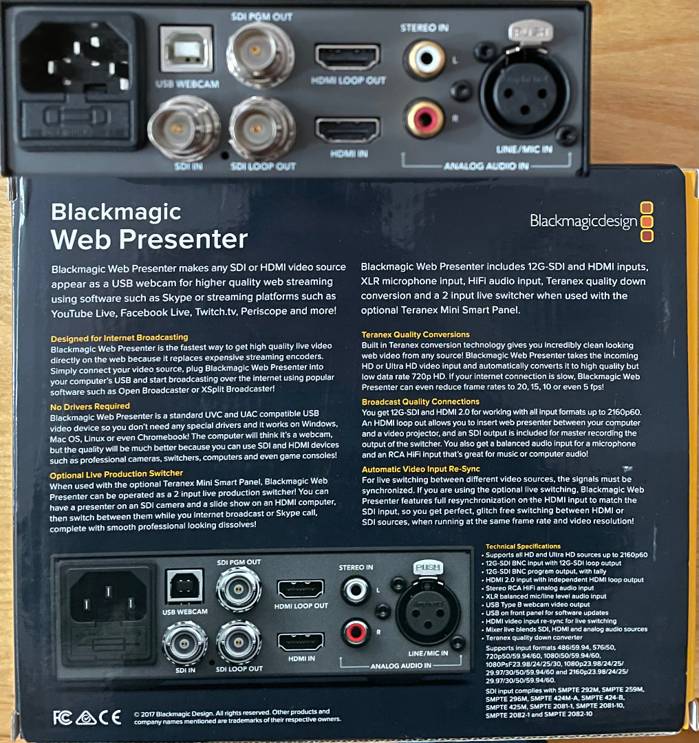 Ich verkaufe meinen Blackmagic Web Presenter. Das Gerät bindet 12G SDI oder HDMI Quellen als WebCam ein und erlaubt so professionelle Quellen für Videokonferenzen oder Streaming zu nutzen.