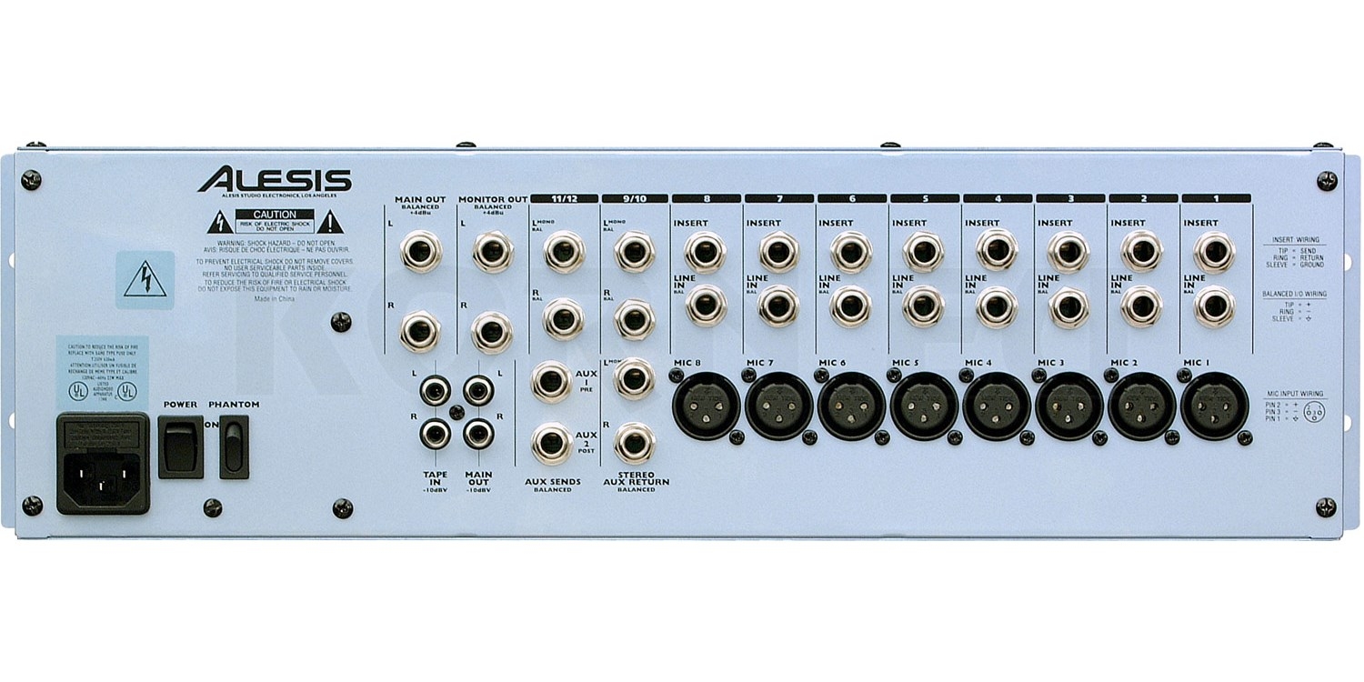 Eingänge: 8 x XLR symmetrisch mit Insert, 4 x 6,3 mm Stereoklinke symmetrisch, 8 x 6,3mm Monoklinke, 2 x Klinke, 2 x RCA
