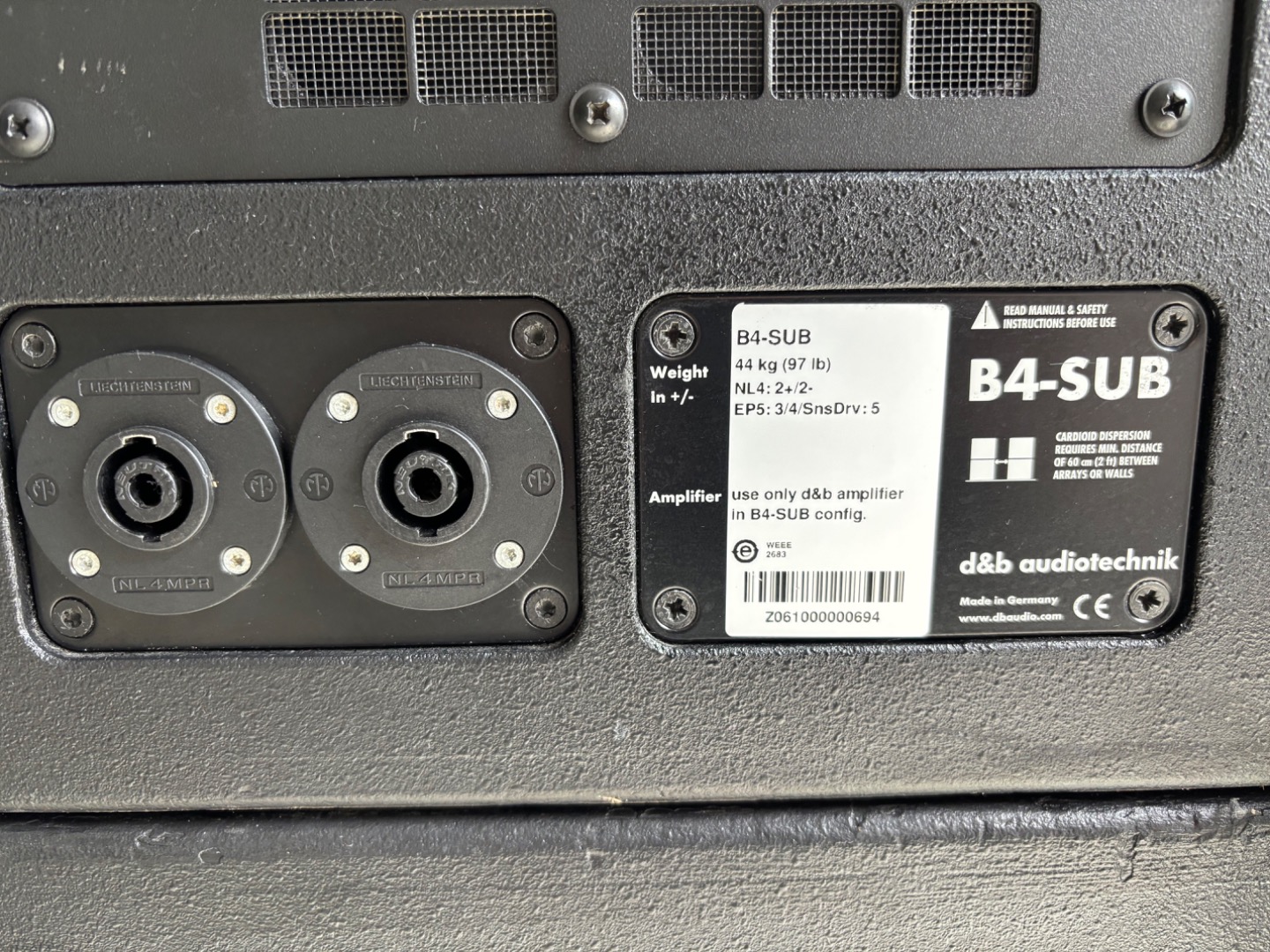 Ich biete hier 4 x D&B Subs, Modell B4 (Cardio). Die Boxen Sind in sehr gutem Zustand daher Festpreis € 2250 € Pro Einheit. Von Privat, daher keine mWSteuer.