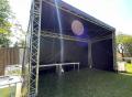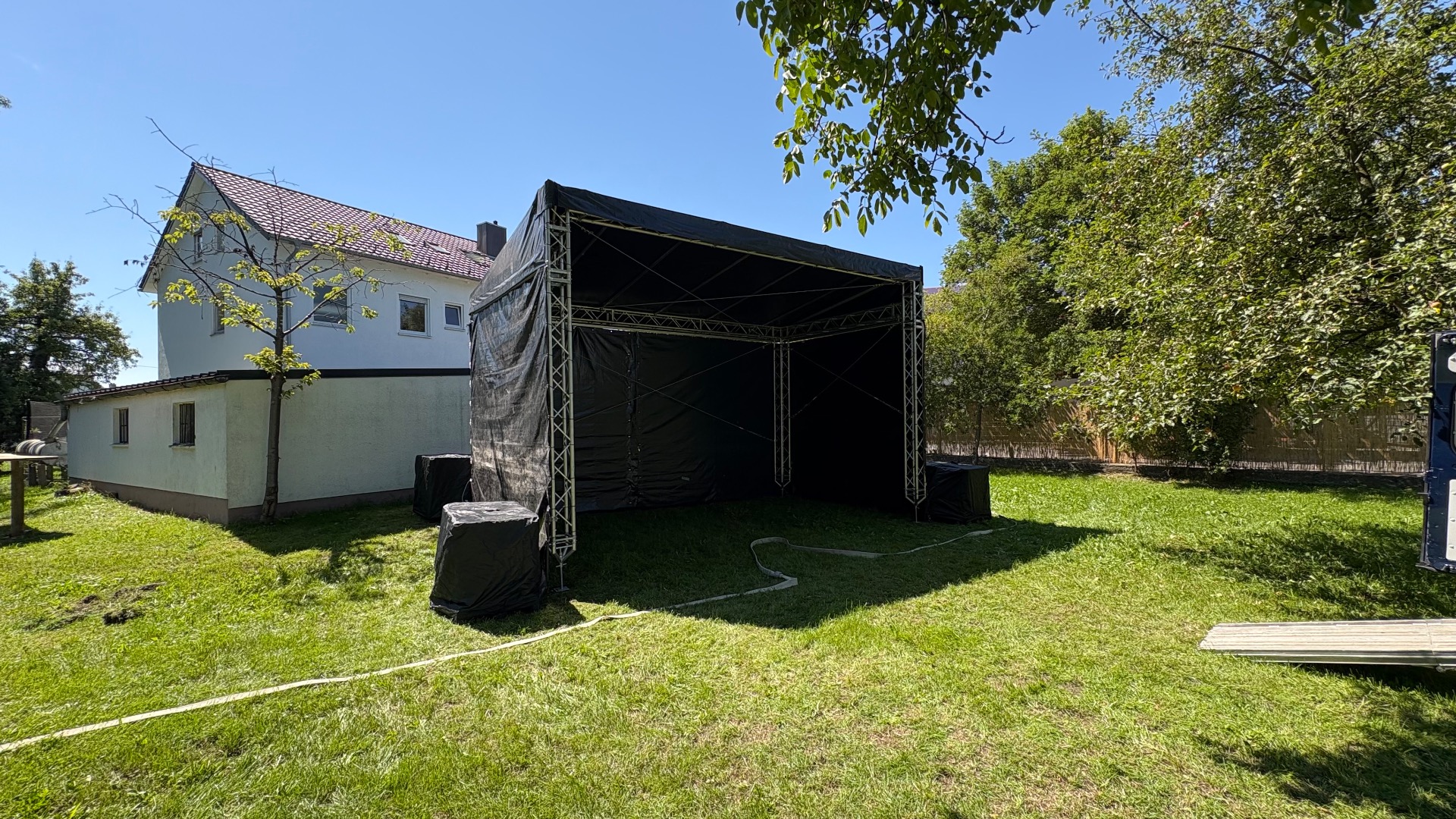 Das Foto zeigt die Bühne mit Seitenplanen usw.