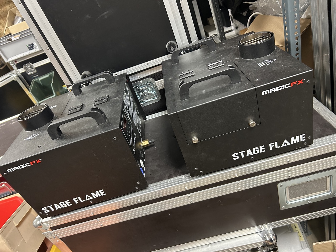 Up for sale are 2 pieces of Magic FX Stage Flame flame effect machines, housed in a sturdy transport flightcase (container). These units have been in use for only approximately 100 hours total, and are being sold due to a model change. The transport rack / flightcase is included as a free bonus with the set.