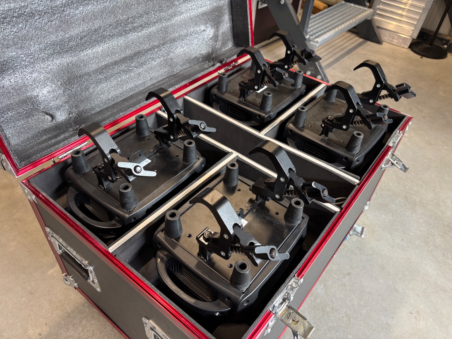 The moving heads come in a flightcase of four and are equipped with fixed trigger clamps on the bottom, making them incredibly easy to hang by simply unfolding them!