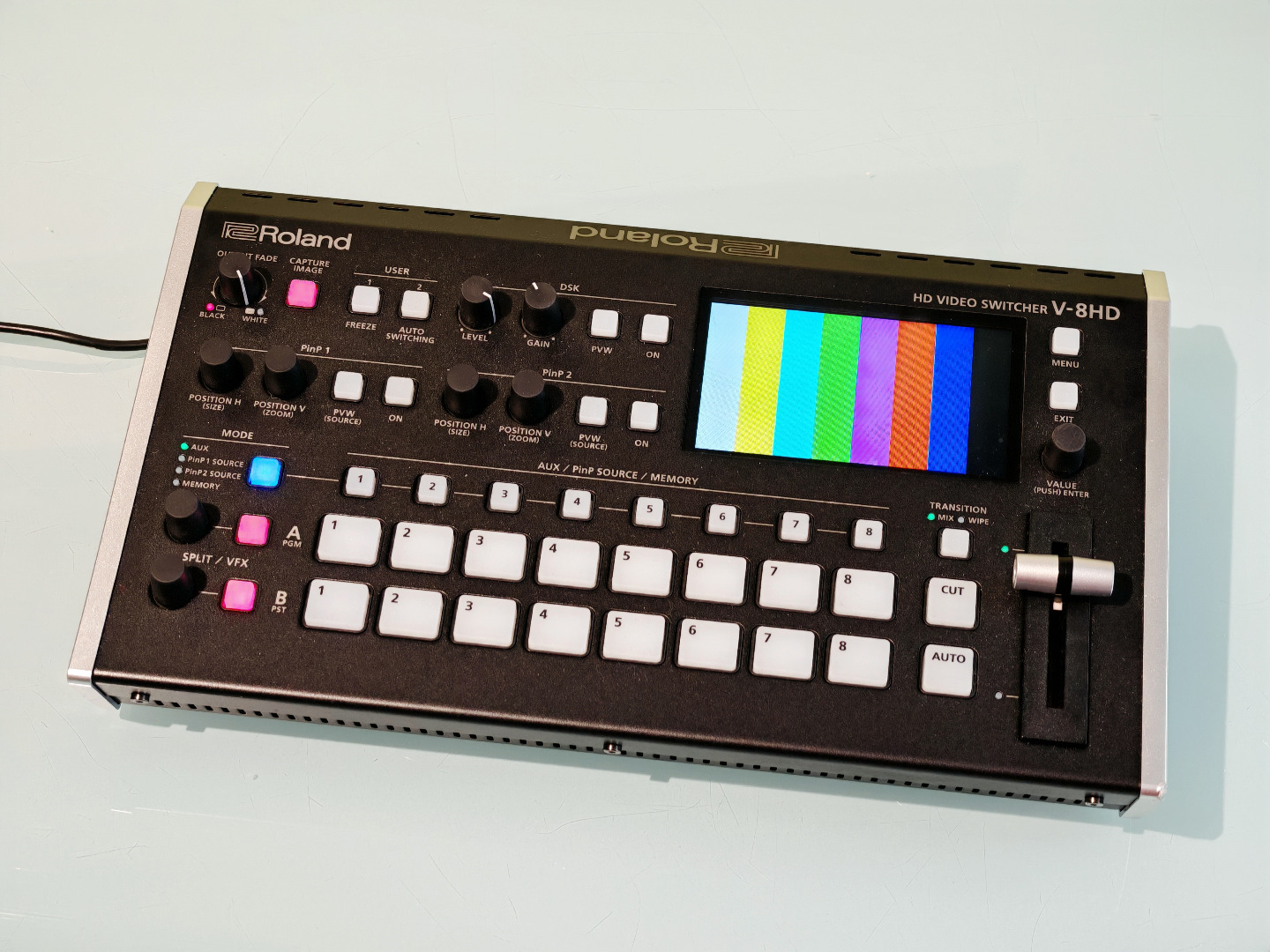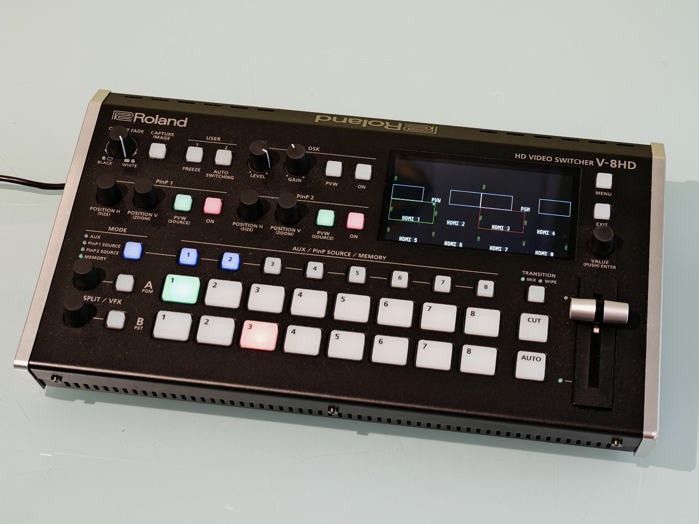Der Roland V-8HD ist ein Full-HD-Video-Switcher mit HDMI-Anschlüssen. Er bietet insgesamt acht HDMI-Eingänge sowie drei (!) konfigurierbare HDMI-Ausgänge. Er hat einen Keying-Prozessor mit fünf Ebenen (Vorschau, Programm, zwei Bild-in-Bild- bzw. Effekt-Layer und Downstream-Keyer). Standbild-Funktion mit acht Speicherplätzen. Dank des integrierten 4,3’’-Multiview-Bildschirms behält man alle angeschlossenen Quellen und die ausgewählten Ebenen stets im Blick. Zu den weiteren Features des V-8HD zählen ein digitaler 18-Kanal-Audiomixer (Software) in Studioqualität oder eine automatische Video-Umschaltfunktion mit drei verschiedenen Modi. Der Mischer hat einen AUX-Weg für die Mischung einer 2. Ebene (etwa Leinwand im Saal).