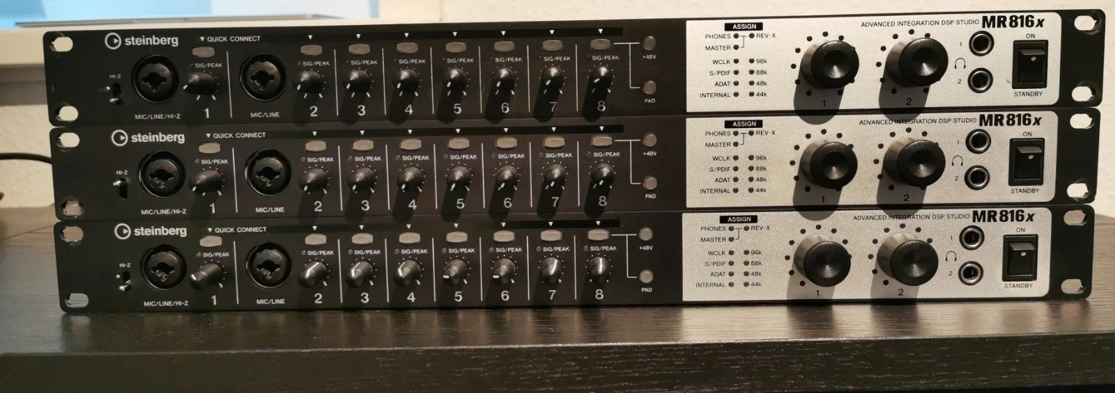 Verkaufe 3 Steinberg Interfaces MR816x, da ich so viele I/O nicht mehr brauche. Die Geräte können mit Cubase (nicht enthalten) kaskadiert werden, so dass alle 3 Geräte dann aus Cubase angesteuert und geroutet werden können ("daisy-Chaining").