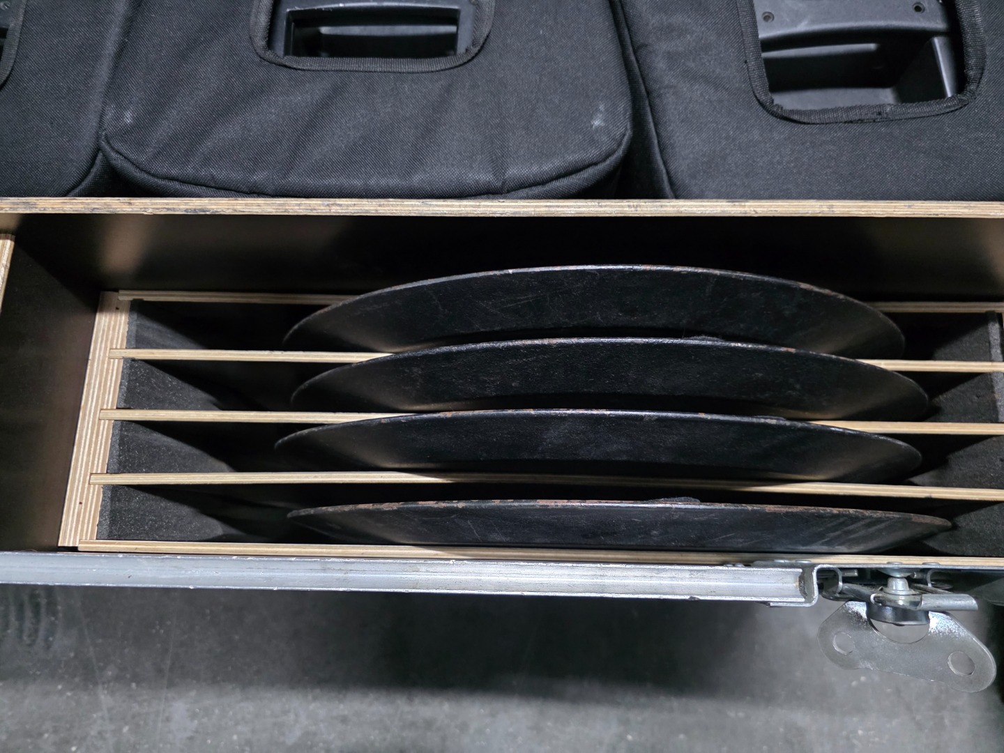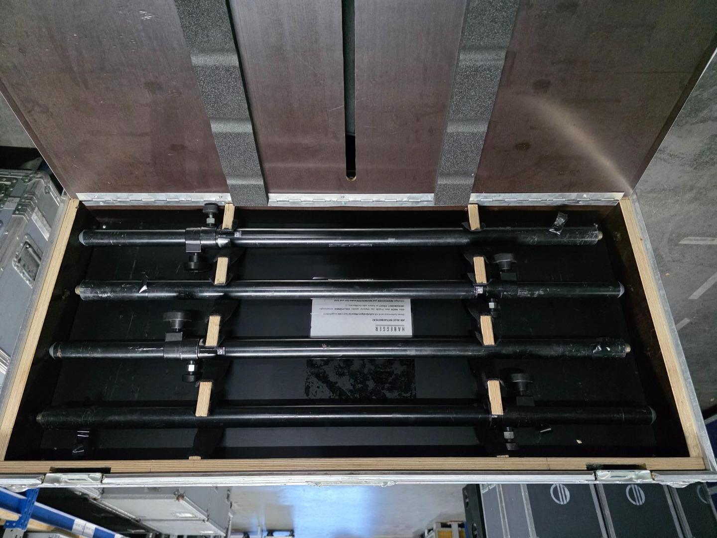 Road case made by Amptown, which contains 4x K&M 26750 Speaker stands with Round Bases.