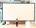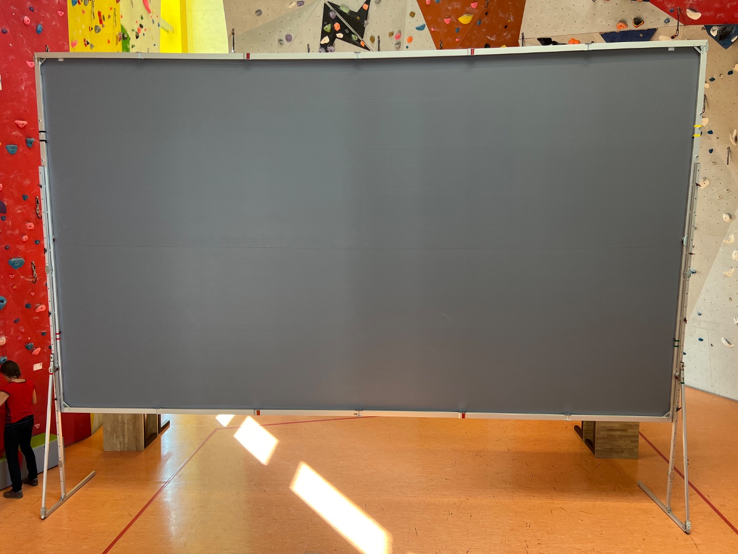 Bei einer Front- oder Aufprojektion wie im Falle dieser Leinwand ist der Projektor vor der Bildleinwand zu positionieren. Die Projektionsfolie wird am Rahmen mit Druckknöpfen befestigt und dadurch sehr einfach faltenfrei gespannt. Die Oberfläche ist perfekt matt, nahtlos und passt genau zum projizierten 16 : 9 Bild.