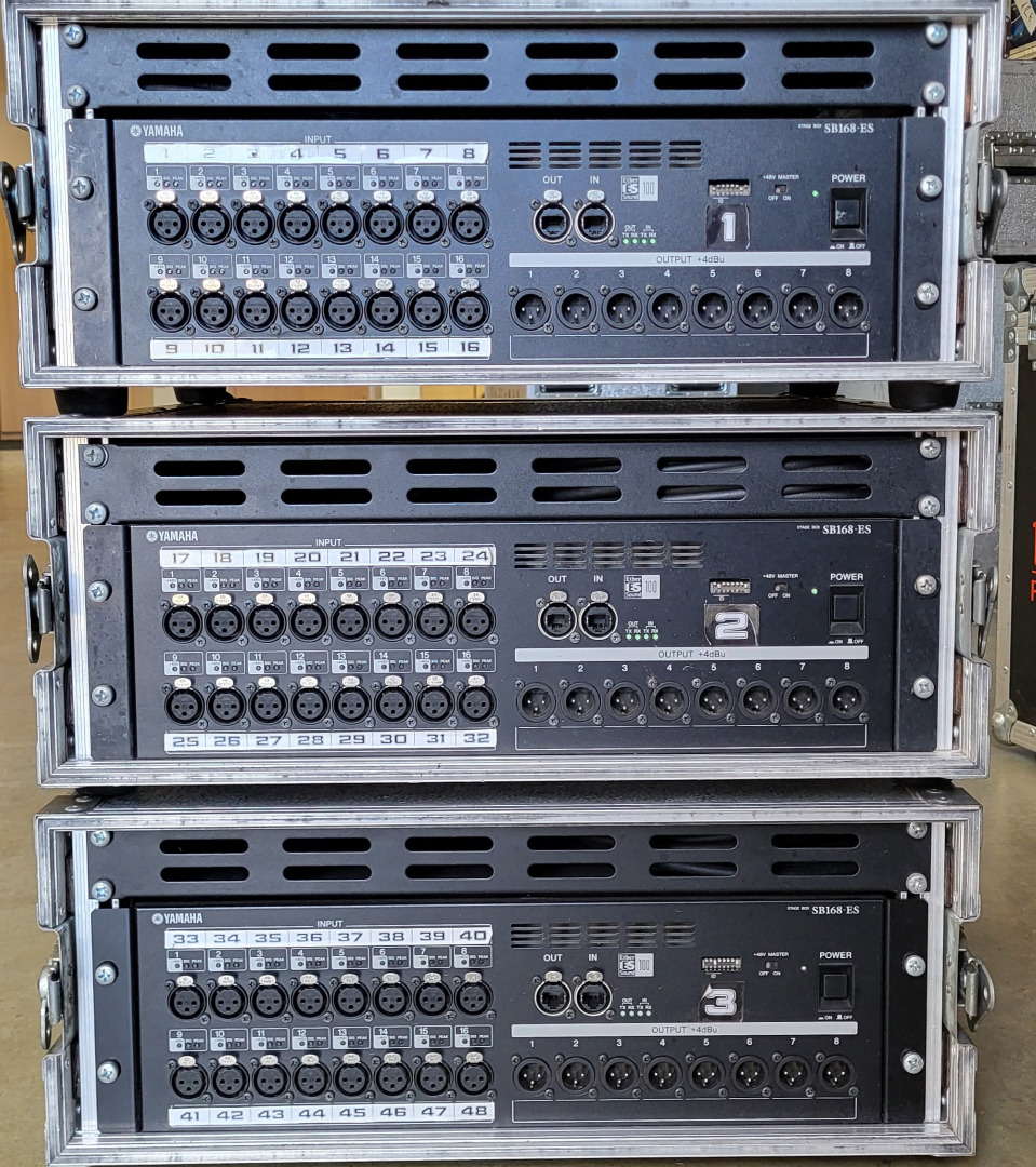 3pcs Yamaha Pro Audio SB168-ES 3U 16in/8out stage boxes in flight cases.