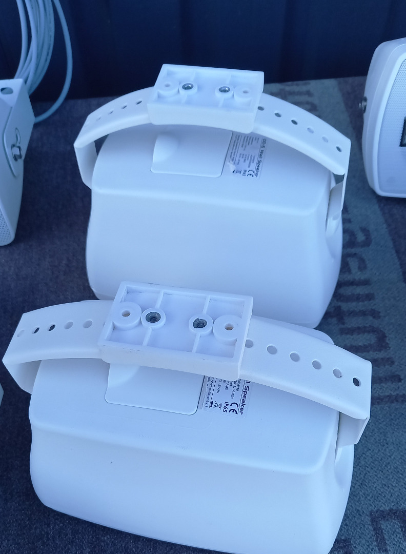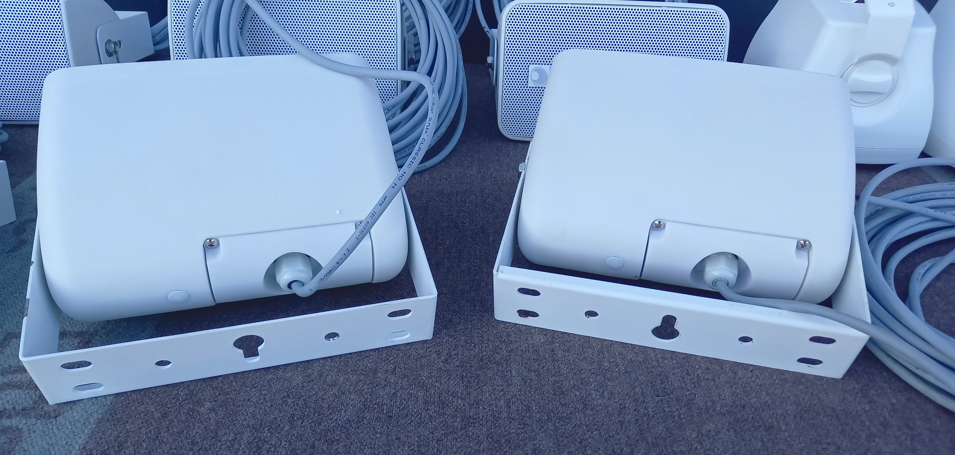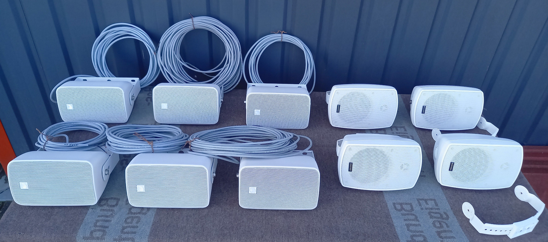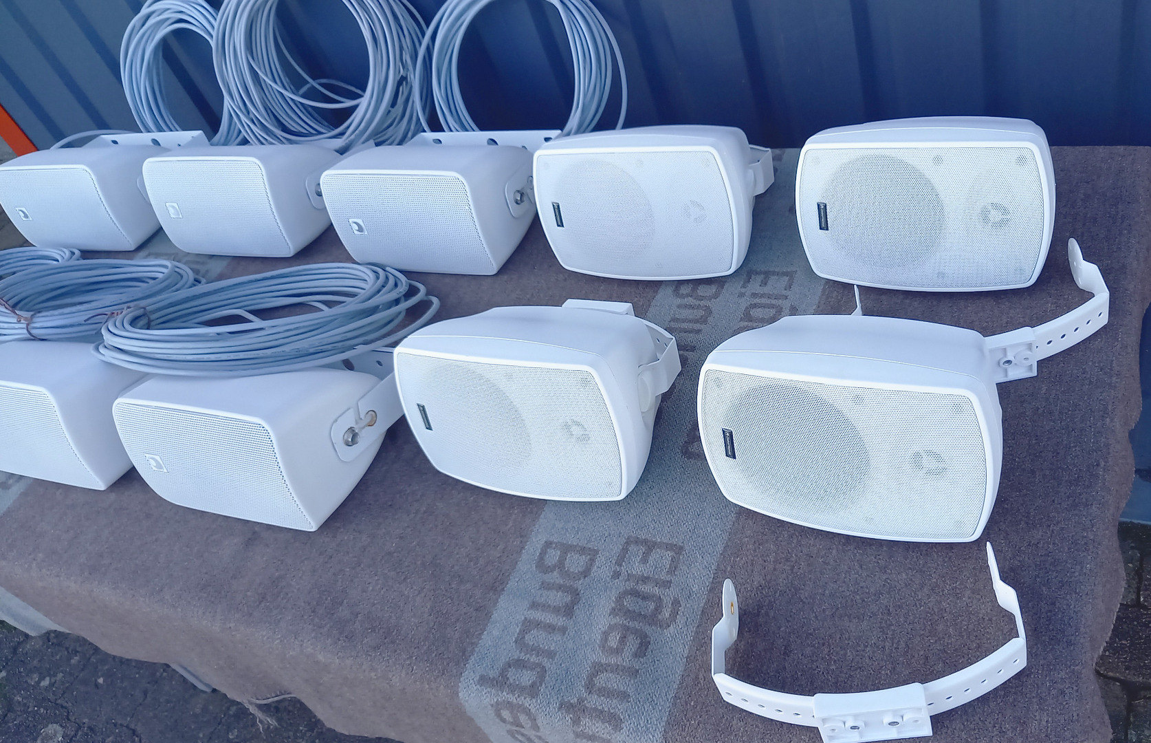 Biete ein Set aus 10 Stück wetterfesten Lautsprechern an, Farbe weiss, alle 10 mit Befestigungsbügeln dabei. 6 Stück Omnitronic OD-5 (an diesen 6 ist jeweils bereits ein langes Kabel dran) 4 Stück Omnitronic ODP-204. Dazu kommt noch ein Satz mit langen Kabeln - siehe Fotos. Die Lautsprecher haben leichte Gebrauchsspuren sind aber sauber und technisch einwandfrei. Ideal für Hintergrundbeschallung oder Weihnachtsmarkt etc.