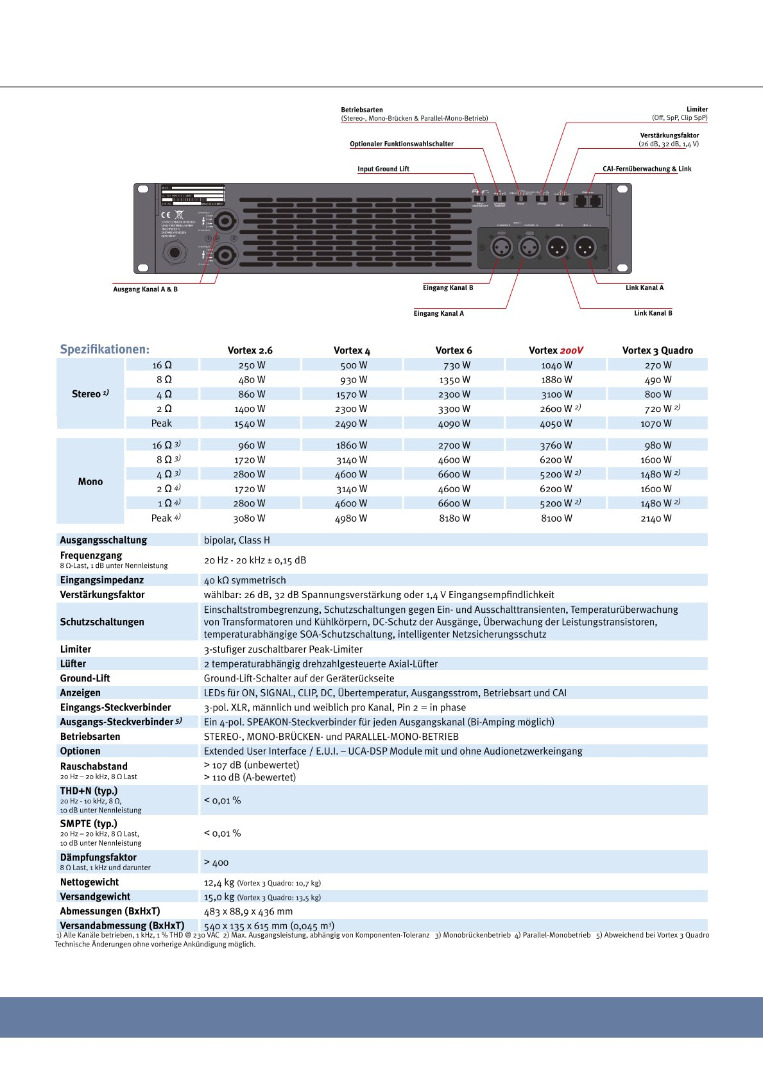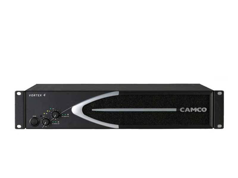 Camco Vortex 4 Features: Hochleistungsendstufe 2x 500 Watt an 16 Ohm 2x 930 Watt an 8 Ohm 2x 1570 Watt an 4 Ohm 2x 2300 Watt an 2 Ohm 1x 3140 Watt an 8 Ohm 1x 4600 Watt an 4 Ohm Modi: Stereo, Bridge Mono und Parallel-Mono Frequenzbereich: 20 Hz - 20 kHz ± 0,15 dB Eingänge: 3-pol. XLR Ausgänge: Speakon Schutzschaltungen: Überspannungs-, Übertemperatur-, HF- und Kurzschluss-Schutz Schutzschaltungen gegen Ein-/Ausschalttransienten, Netzunterspannung, Gleichspannungs- und Subsonicsignale Maße: 483 x 88,9 x 436 mm (19", 2HE) Gewicht: 11,7 kg
