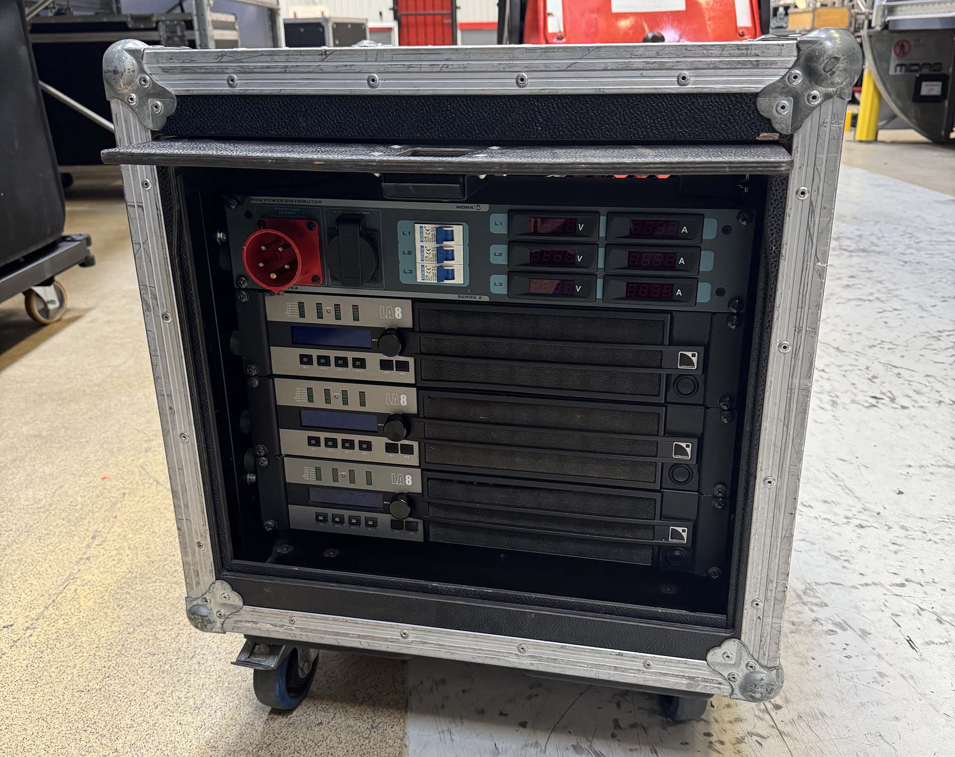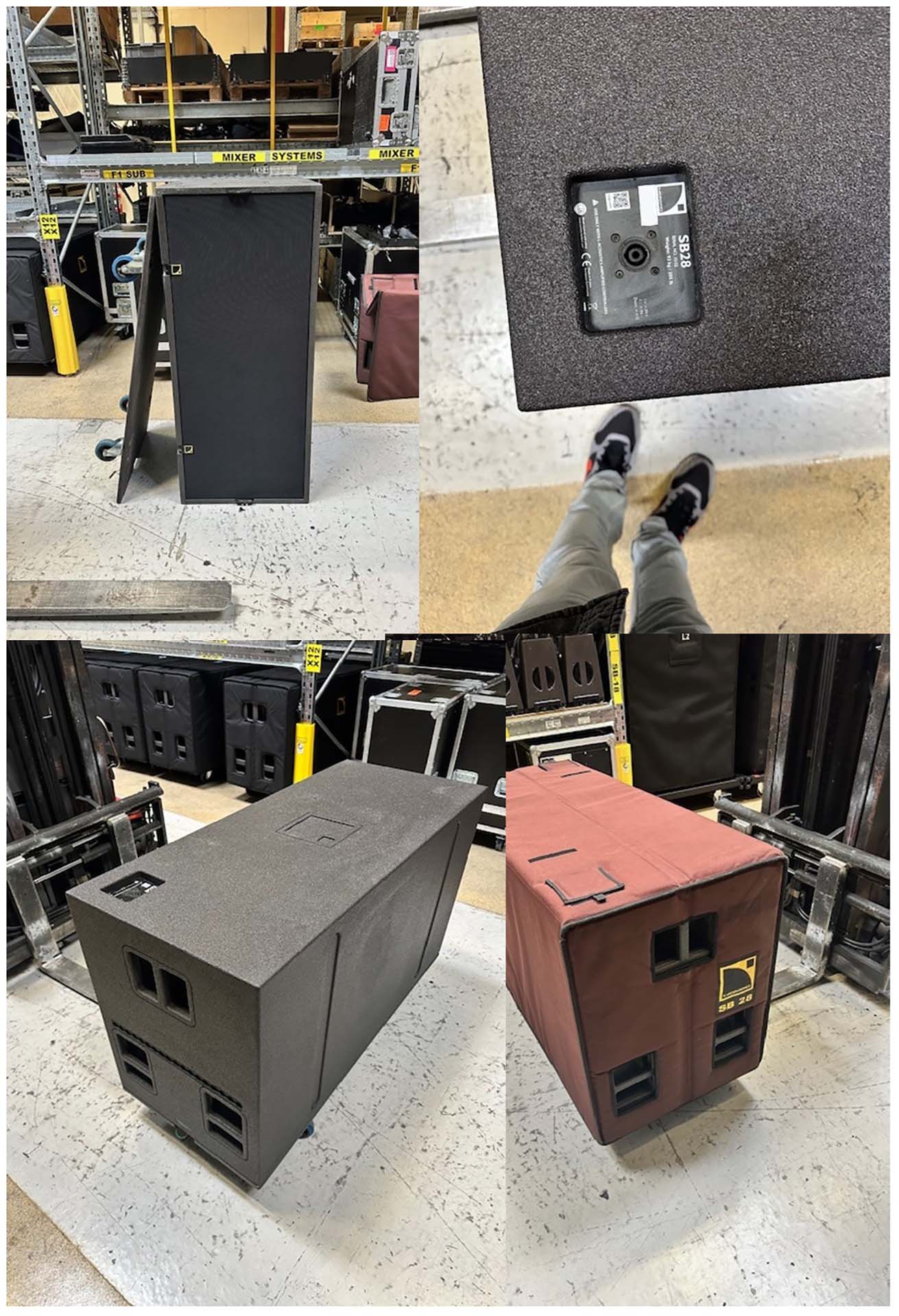Comprehensive audio system bundle including 24 KARA II line array elements, 8 SB28 subwoofers with dollies and covers, 8 SB18 subwoofers with dollies and covers, rigging accessories (M-BUMP, M-BAR, M-JACK kits), KARA pull backs, array adapters, 9 LA8 amplifiers, various transport cases for KARA II and accessories, power distribution units, and a cable kit—ideal for professional sound reinforcement applications.