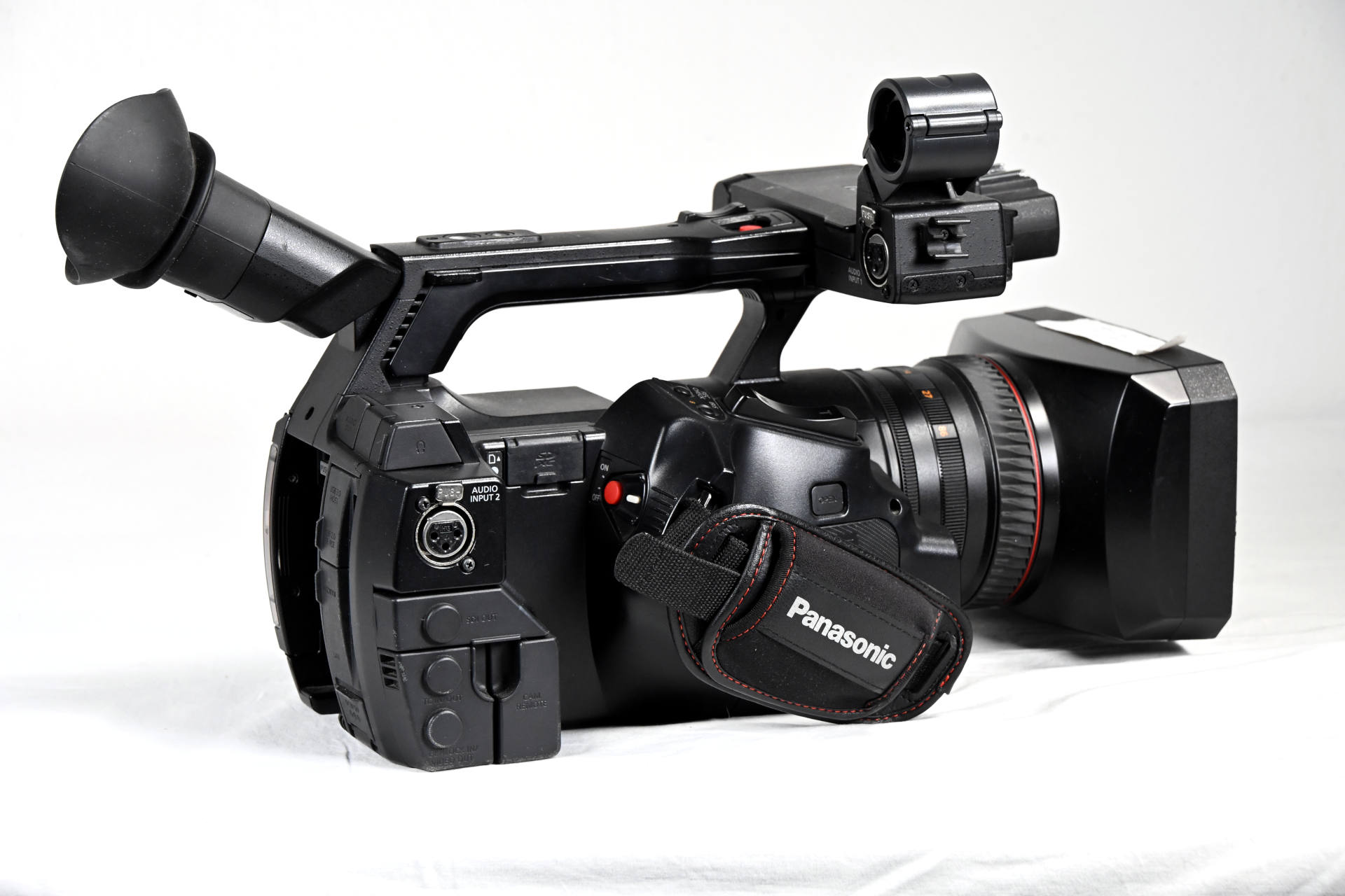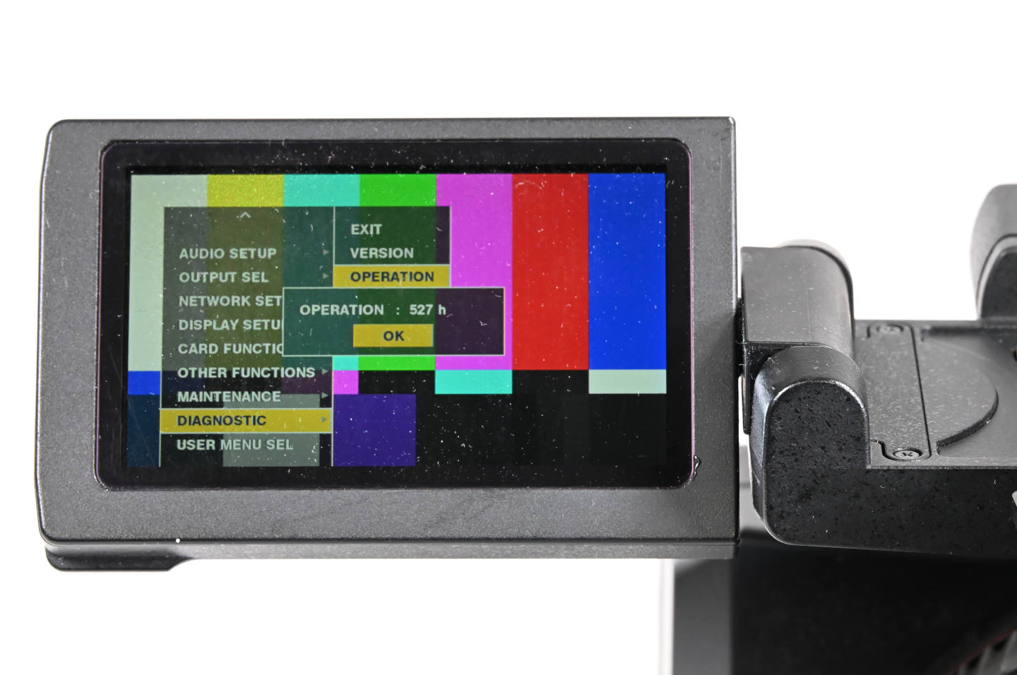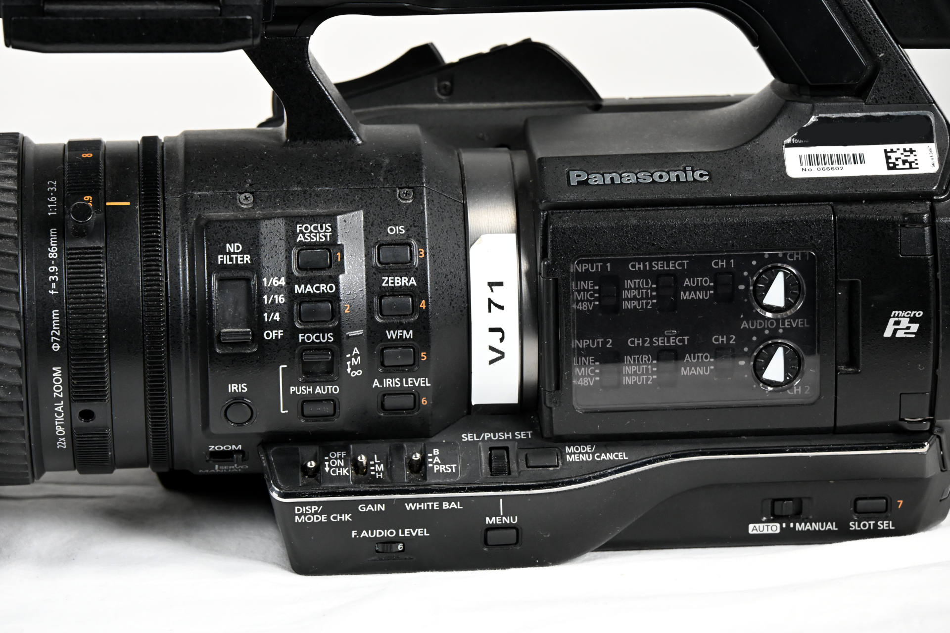 Compact professional camera bundle includes Swit and Panasonic batteries with charger, two 64GB P2 memory cards, and a power supply. The camera has been operated for only 527 hours, indicating low usage. Ideal for video production environments requiring reliable performance.