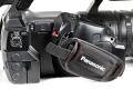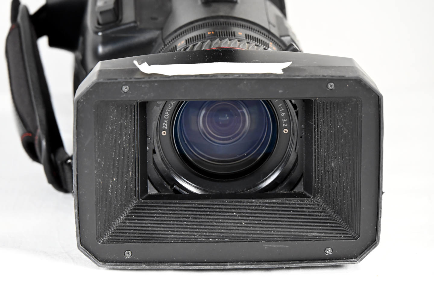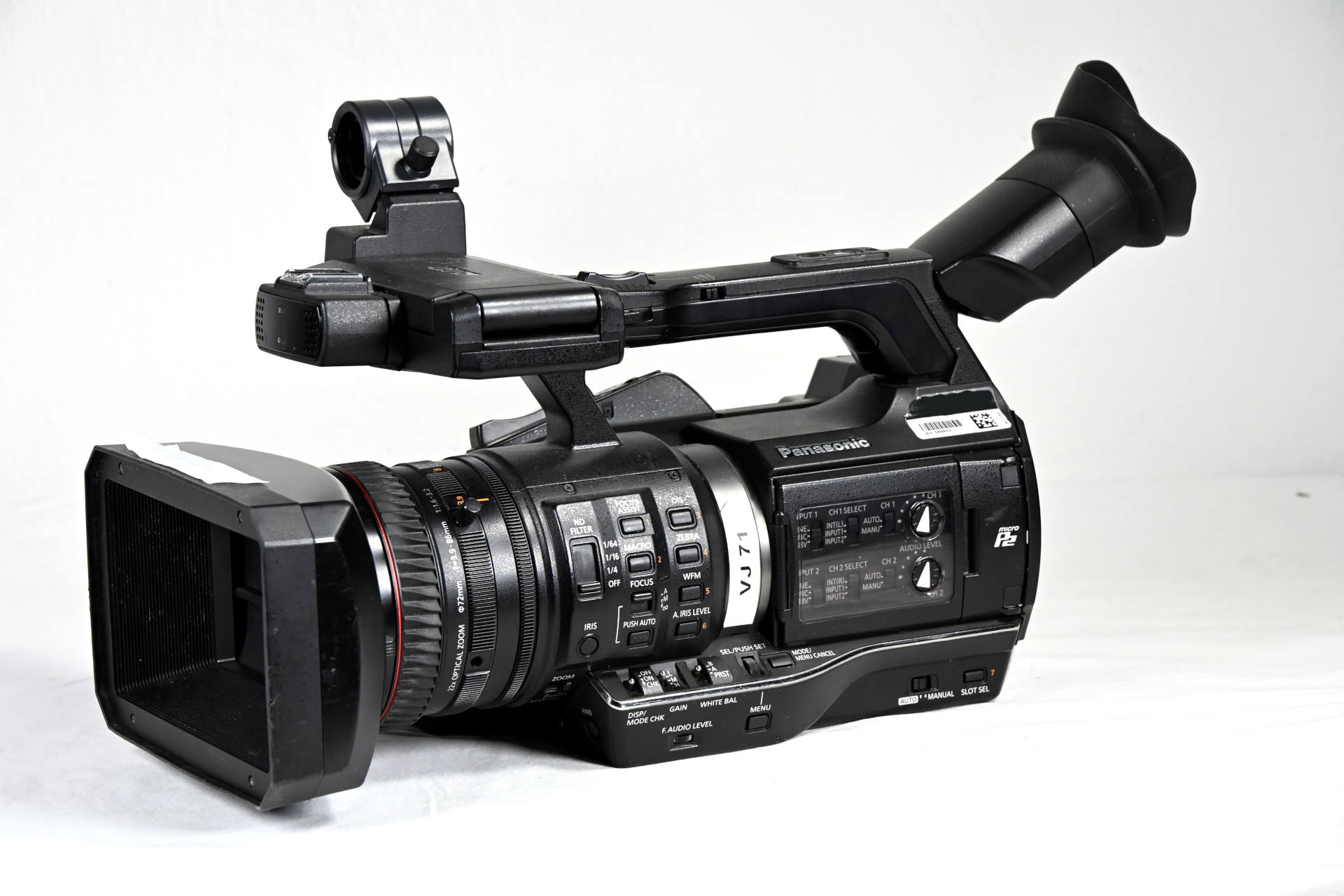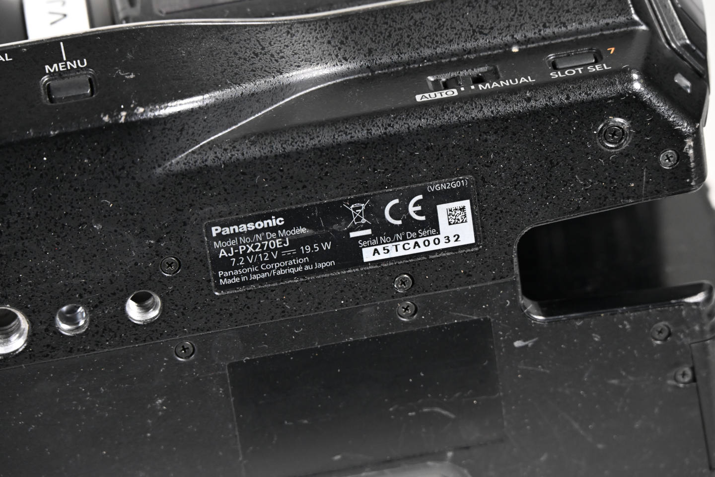 Compact professional camera bundle includes Swit and Panasonic batteries with charger, two 64GB P2 memory cards, and a power supply. The camera has been operated for only 527 hours, indicating low usage. Ideal for video production environments requiring reliable performance.