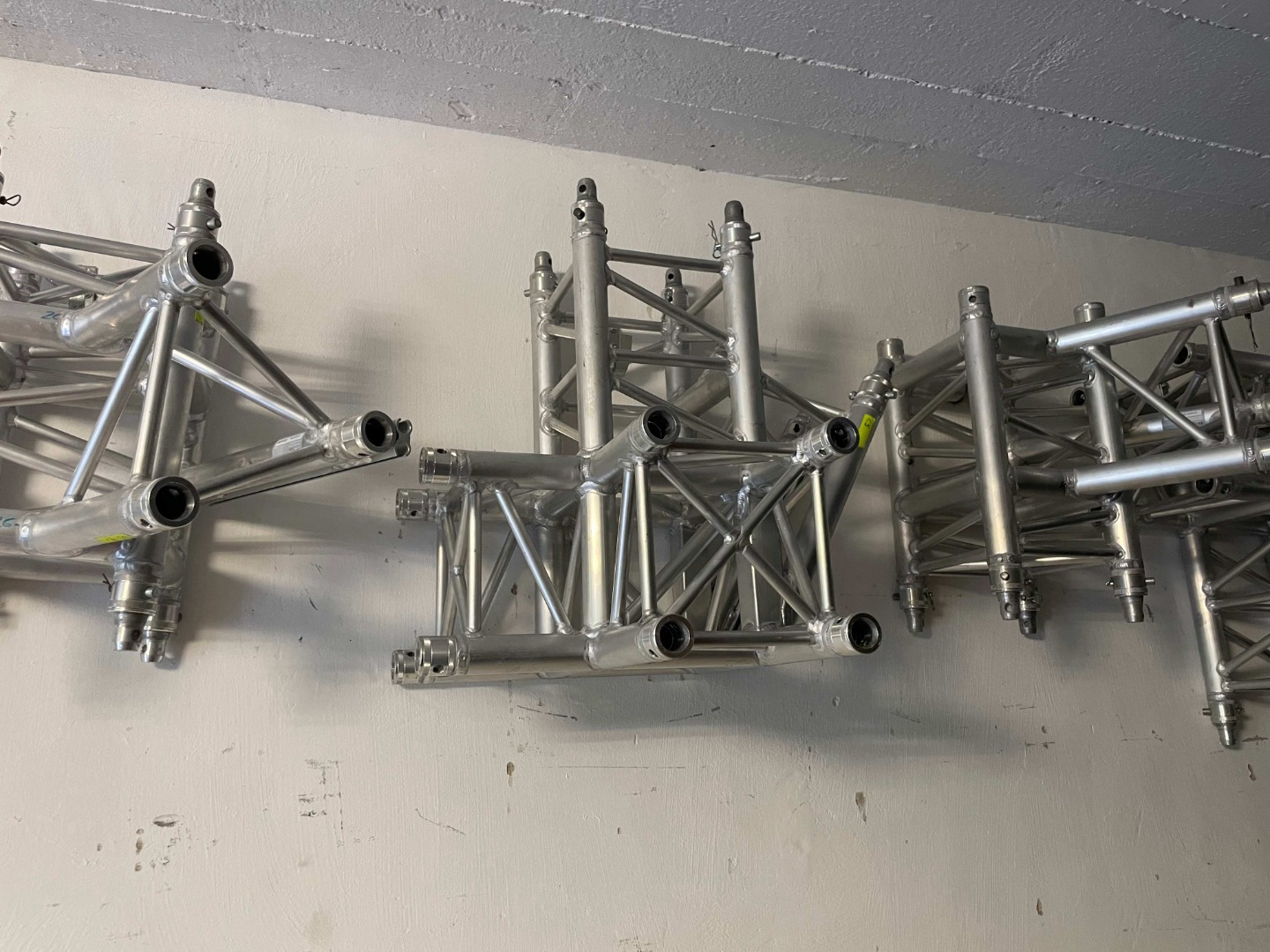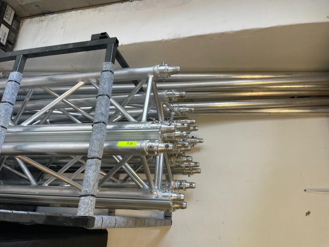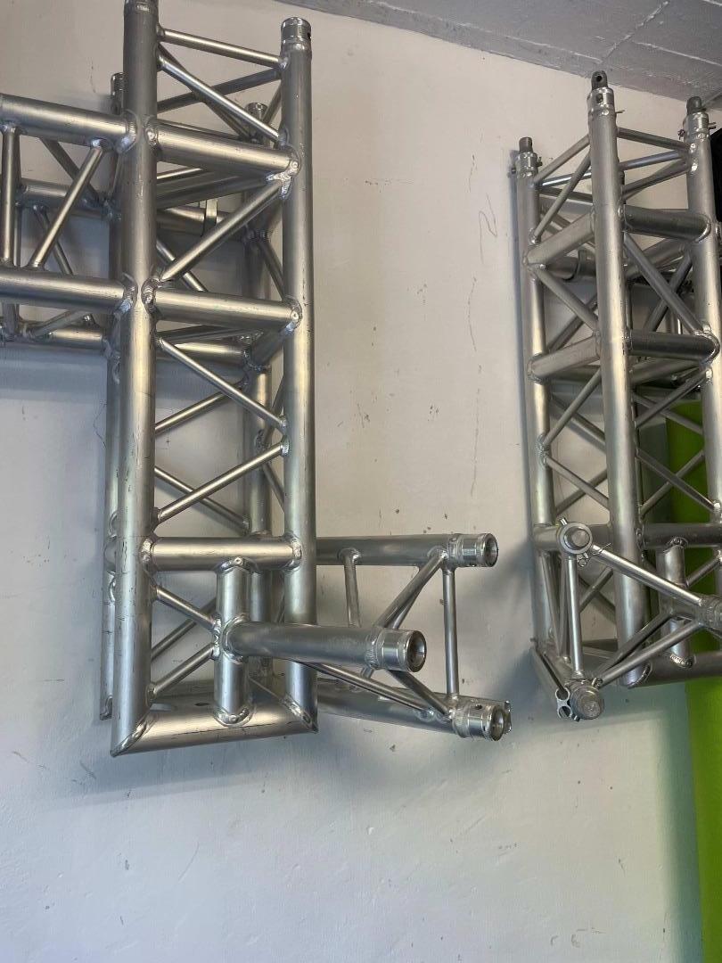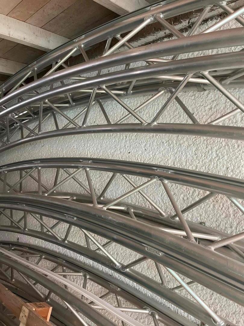 - alle Sonderteile, Dachleiter und Rundbogentraverse mit Kederschiene für die Dachkonstruktion für 6x4 und 8x6m und zusätzlich Global Truss Stücke für den Aufbau der Bühne 6x4m (für den Bau 8x6m werden weitere Traversen gebaut, die im Angebot nicht enthalten sind, aber ggf. ebenfalls veräußert werden könnten)