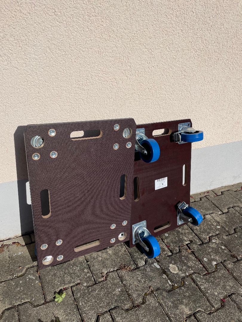 Wheelboard mit je 2 gebremsten/ 2 ungebremsten Blue Wheels. Maßgefertigtes Cover mit 10mm Polsterung.