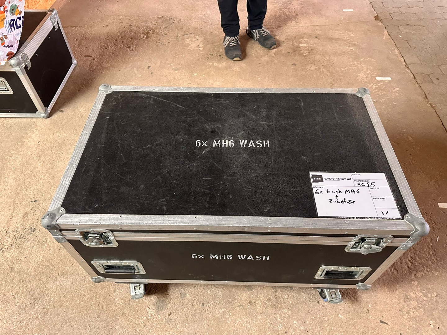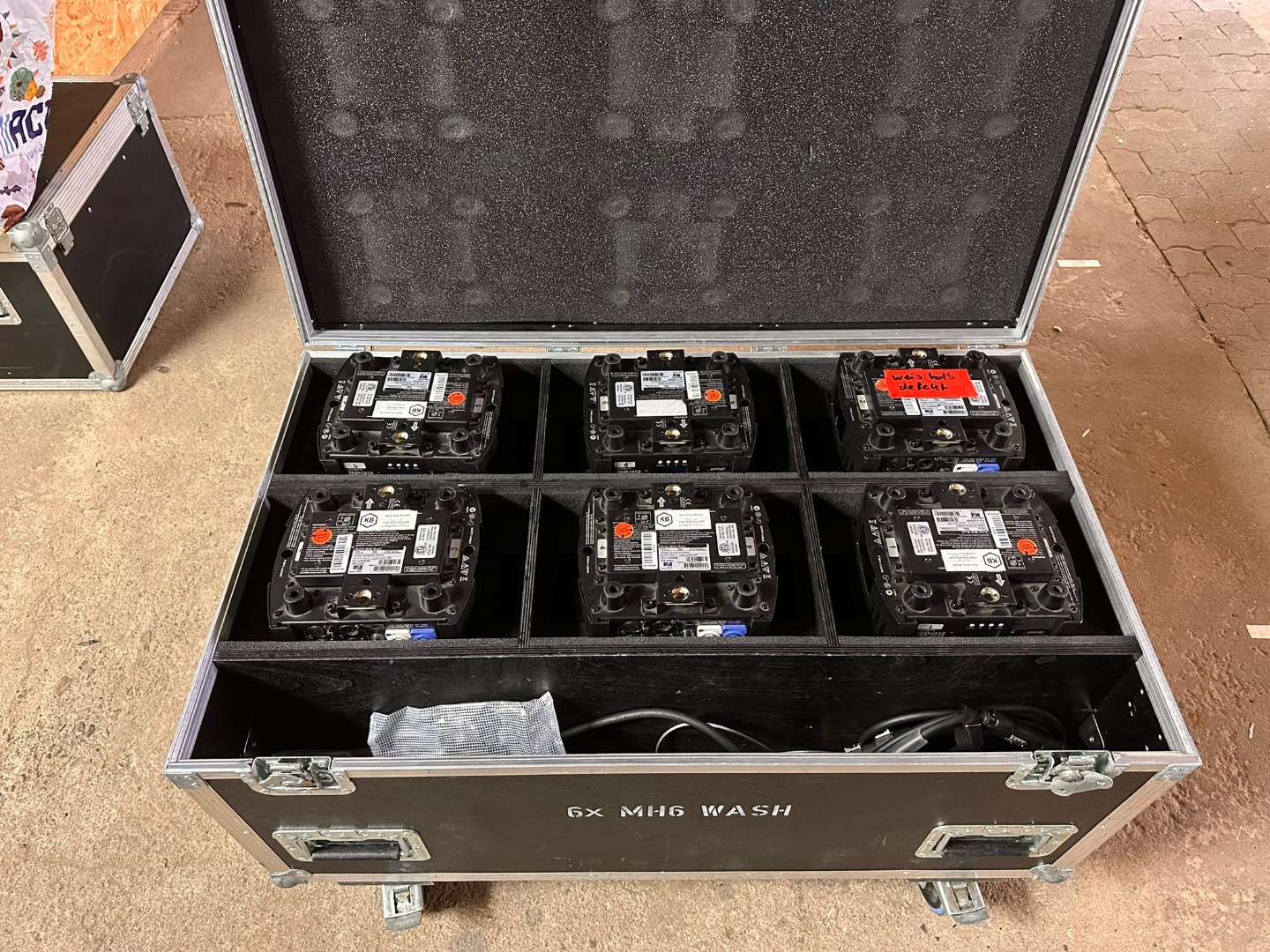 Wir verkaufen hier unsere Martin Rush MH6 Moving Washer im praktischen 6er Case mit Zubehör: Pro Lampe je ein Bracket und Clamp, Powercon Kabel und Safety.