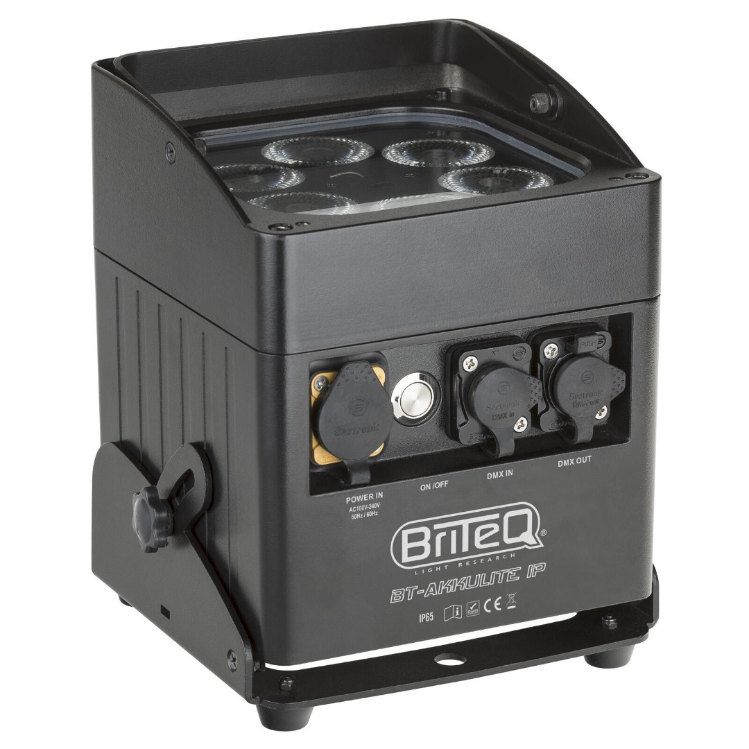 Der Briteq BT-AKKULITE IP ist ein Akku betriebener LED-Scheinwerfer der auch ohne bedenken im freien verwendet werden kann. Ausgestattet ist der LED-AKKU-Scheinwerfer mit ins gesamt 6 x 10 Watt RGBAW LEDs, somit können schöne Farbkombinationen erzeugt werden. Die LEDs haben einen Abstrahlwinkel von 22°. Für die Ansteuerung des Akku-Scheinwerfers kann das interne drahtlose Transceiver-Modul (Sender und Empfänger) genutzt werden (100% kompatibel mit dem W-DMX-G4-Protokoll von „Wireless Solution Sweden“) oder die Ansteuerung erfolgt über einen externen DMX Controller mit einer Kabelverbindung.