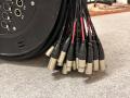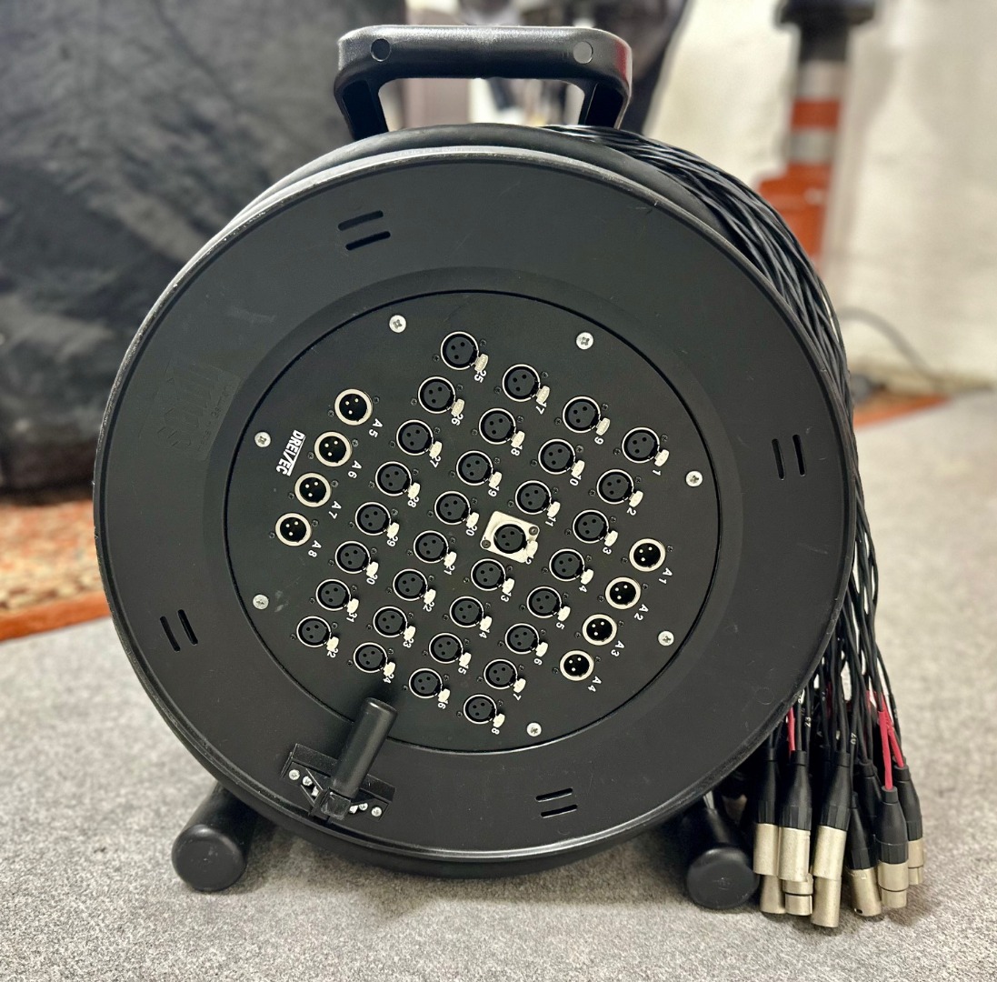 Multicoresystem 32/8 Stagebox in Schill-Kabeltrommer GT 450 integriert mit fest angeschlossenem 40m Kabel. Paarweise abgeschirmt und Gesamtschirm auf gesplisste Peitsche mit Splitting-Schutz. Zusätzlicher Knickschutz durch bedruckte Schrumpfschläuche an der Steckereinführung der Peitsche mit Amphenol-Stecker.