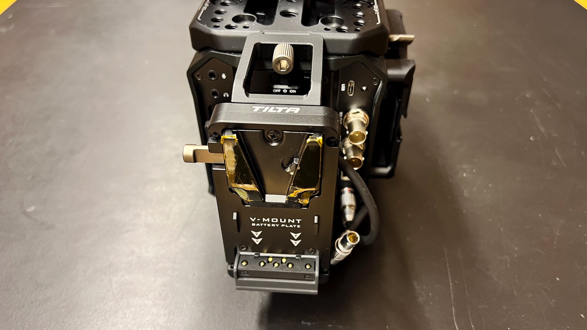 Handgriff, einer V-Mount Speiseplatte. Die Kamera wurde im Sommer 2025 gekauft und