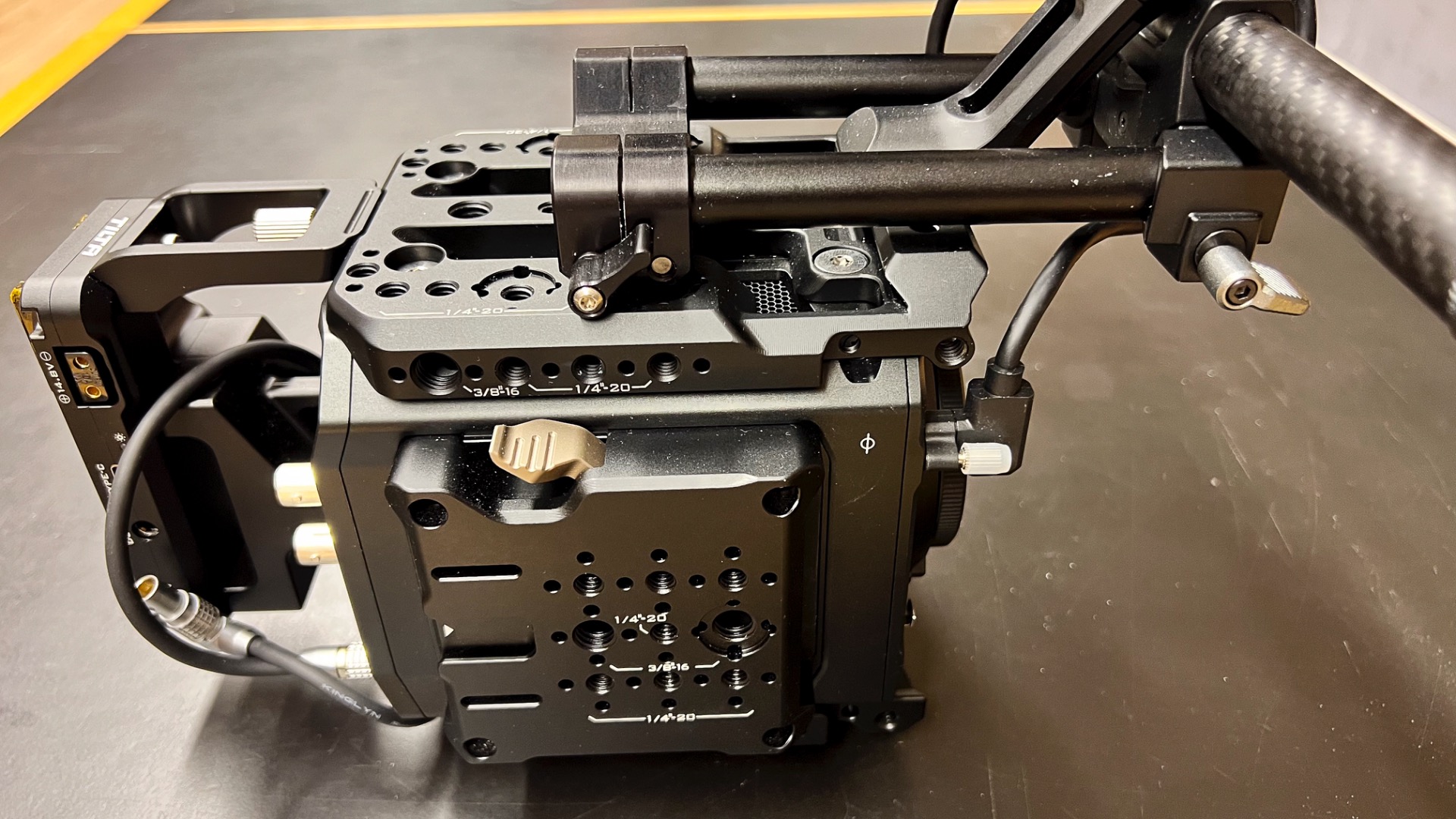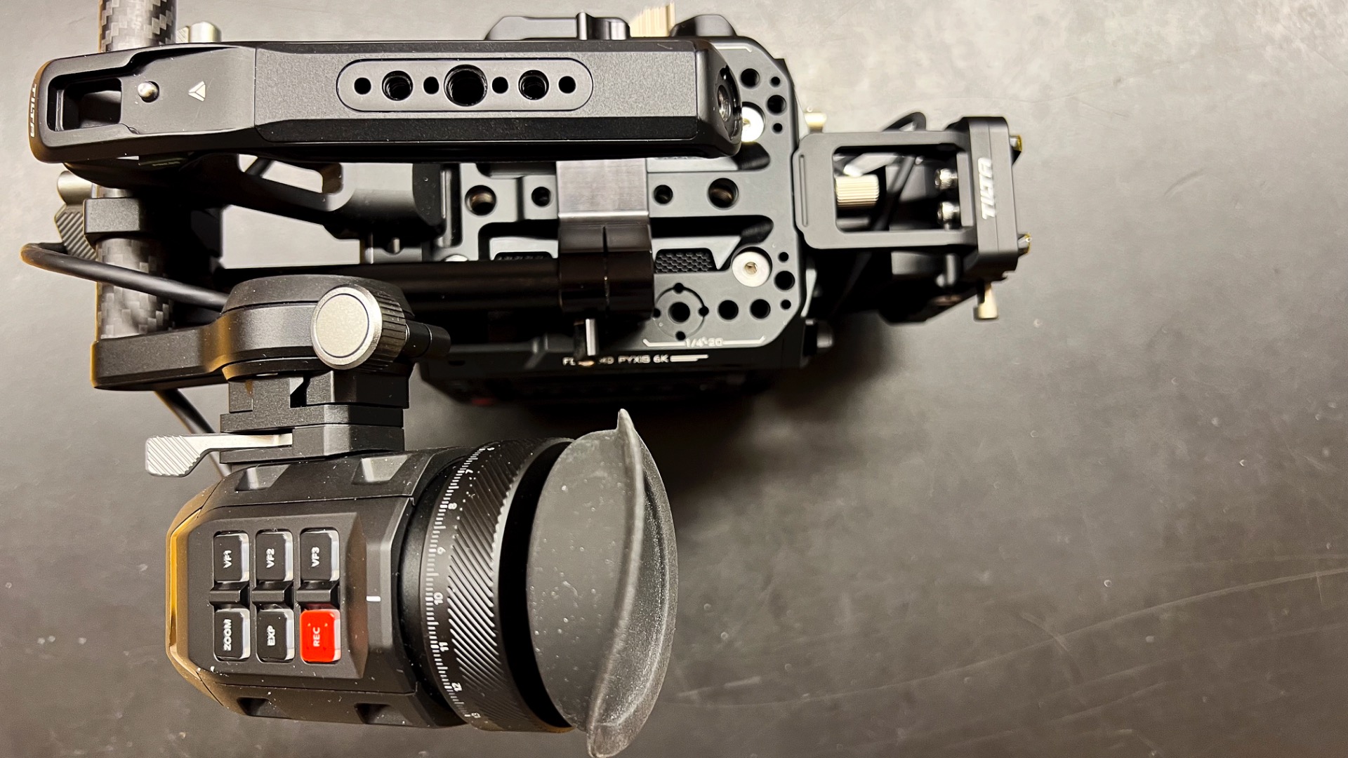 Die Kamera ist ausgestattet mit einem Ursa Cine EVF , einem Tilda Kamera Cage mit