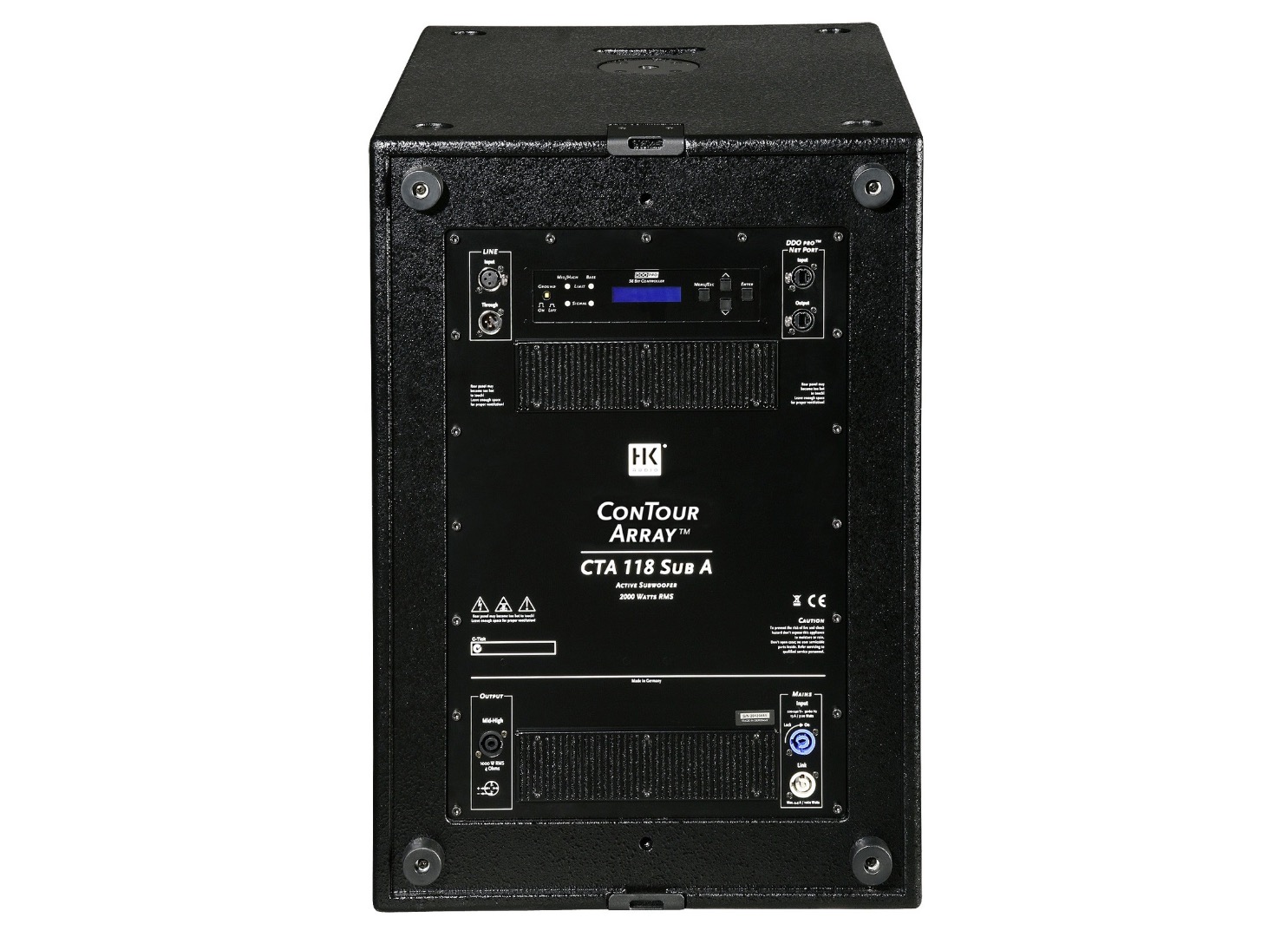 Der aktive direktgeladene 18“ HK-Audio CTA 118 SUB bildet das Herzstück dieser Anlage und beinhaltet mit dem 56 Bit DDO-Pro Digitalcontroller sowie zwei 1000 Watt RMS PWM Endstufen die komplette Elektronik. Eine der Endstufen betreibt den 18“ Lautsprecher des Subwoofers, die zweite wird vom Controller für den Betrieb eines Mid/High-Elementes bzw. einer ConTour Series CT 108, CT 112 oder CT 115 Lautsprecherbox konfiguriert.