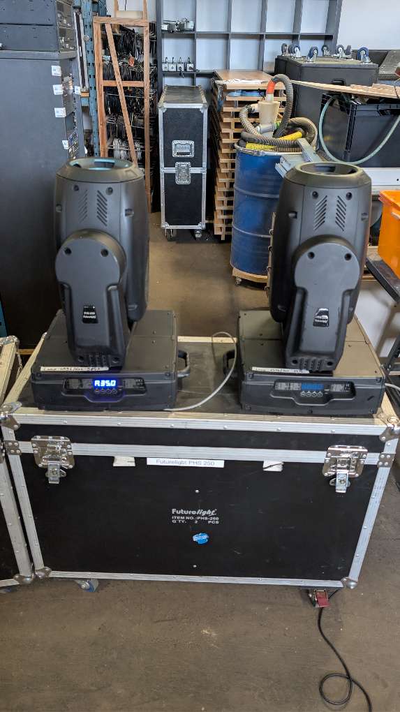 Wir trennen uns von ein paar unserer alten Arbeitstiere – Futurelight PHS-260 Moving Heads, insgesamt 8 Stück, verpackt in 4 robusten Doppelcases (je 2 Geräte pro Case).