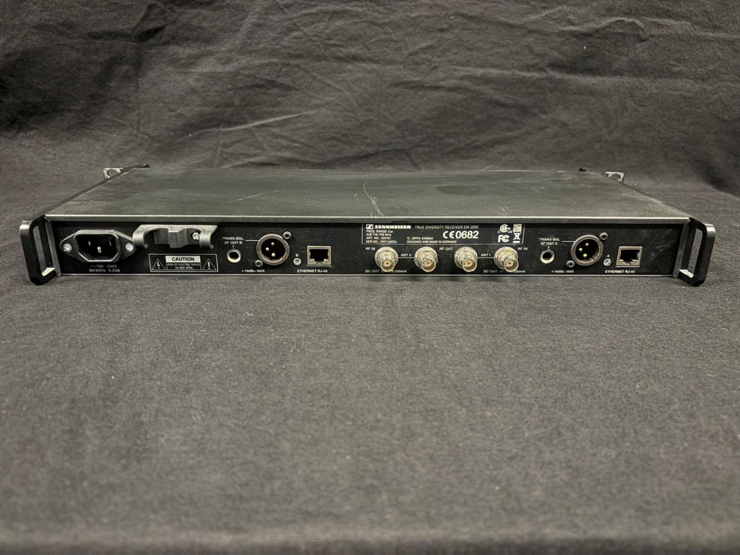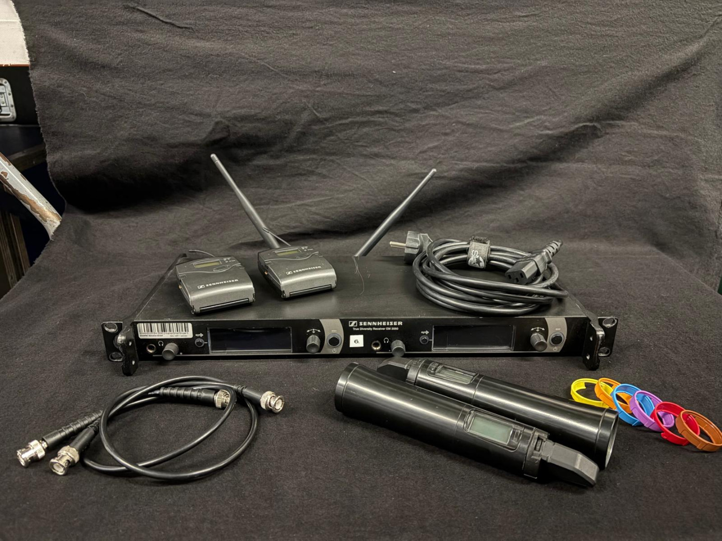 Das Funkmikrofon Set besteht aus einem Doppelempfänger, der Sennheiser EM 2050 im CW-Frequenzband (718 – 790 MHz), zwei Mal dem SKM 2000 Handsender ohne Kapsel und zwei Mal dem SK 2000 Taschensender. Die Geräte sind vollkommen funktionsfähig und waren auch bis vor kurzem noch im Einsatz.