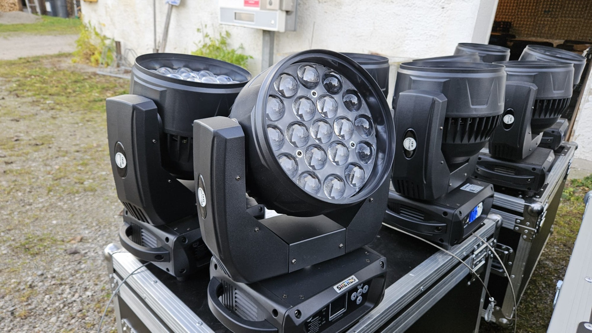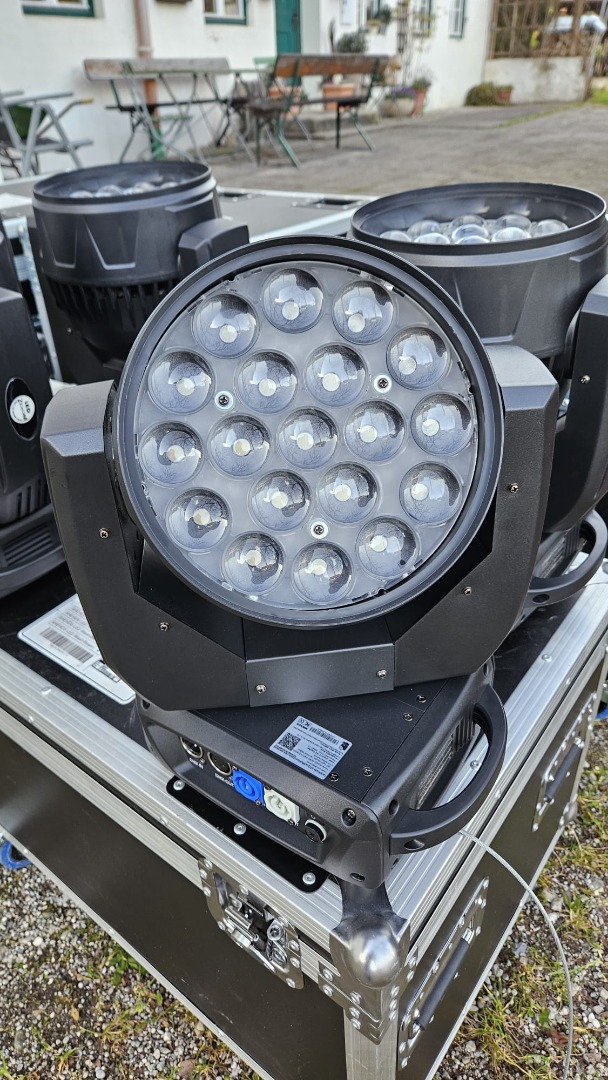Zum Verkauf steht ein Set aus 10 professionellen LED Moving Heads des Typs SHEHDS 19x15W RGBW 4-in-1 Zoom Wash, inklusive 2 gebrauchter Roadinger Flightcases (jeweils für 4 Geräte).