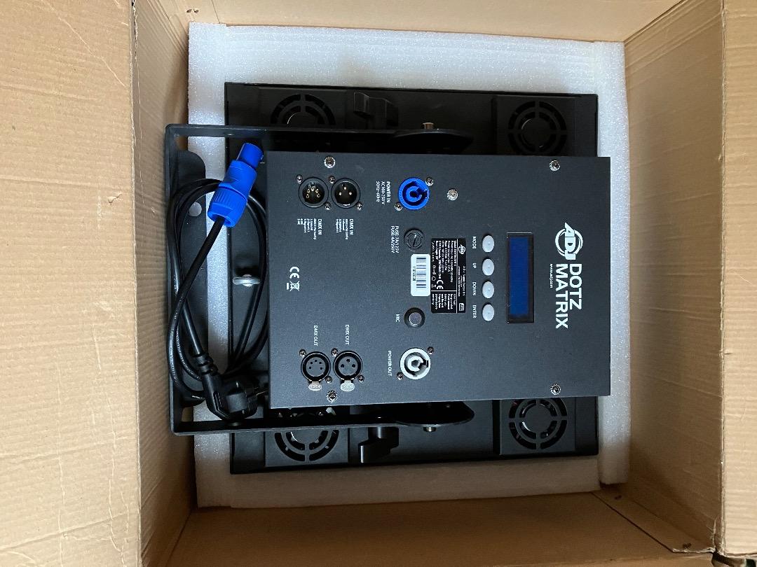 The fixture has many pro features such as: 0-100% electronic dimming, strobe/pulse effect, built-in shows and colors macros, a 4-button DMX LCD display, locking Power connector In/Out, 5 selectable Dim Curves for stage lighting, 4 Pixel Flipping options, and 5 DMX channel modes. Dotz Matrix may run in its stand-alone mode from built-in programs, sound actively or from a DMX Controller.