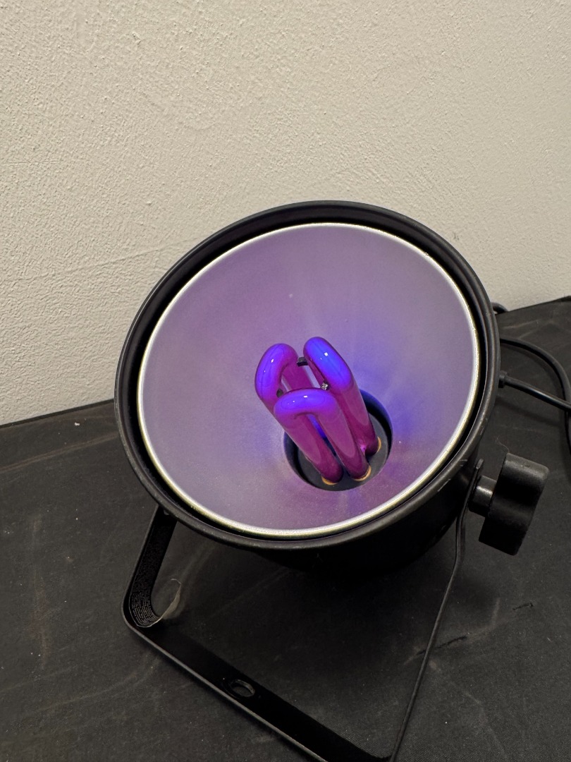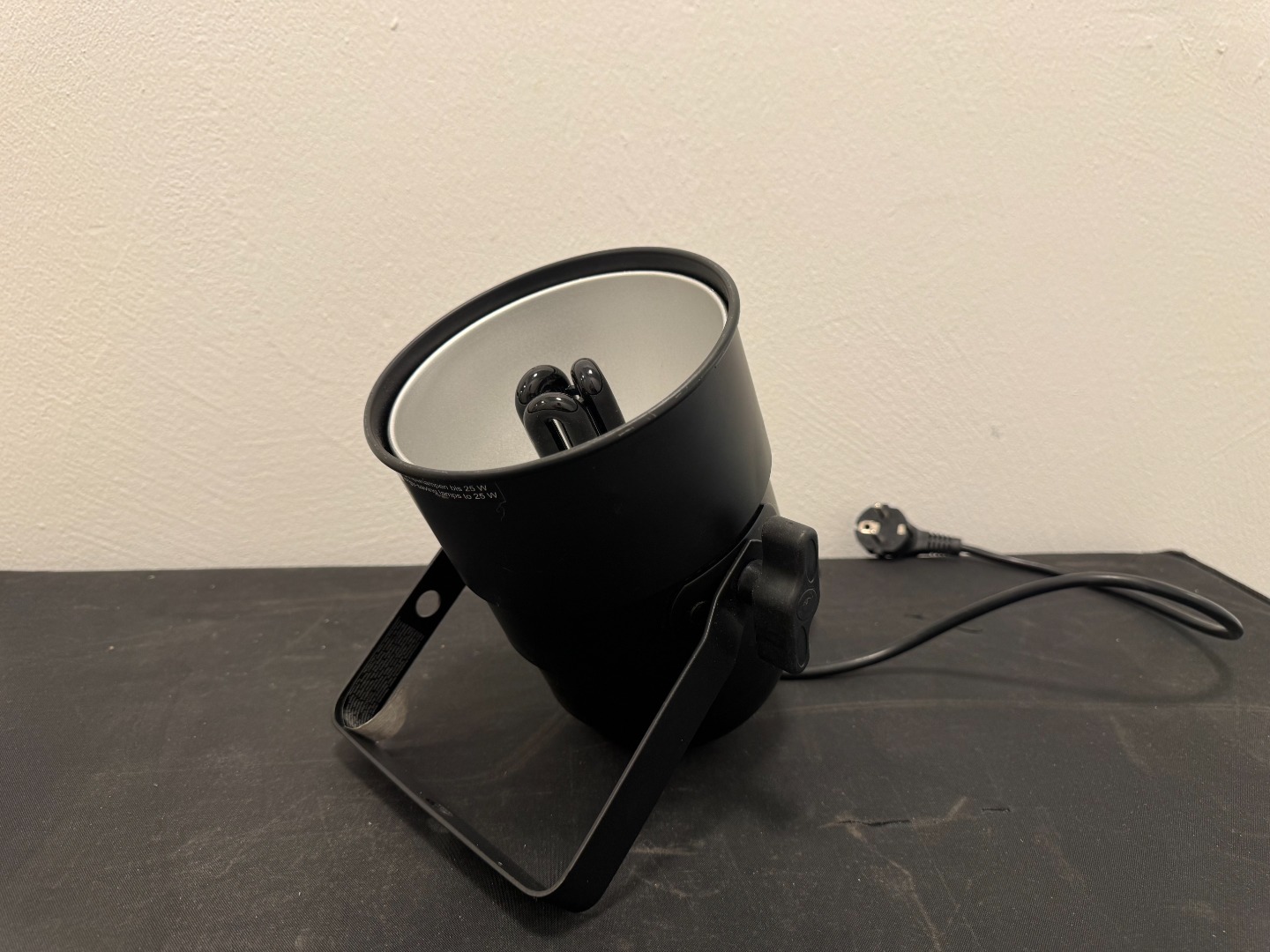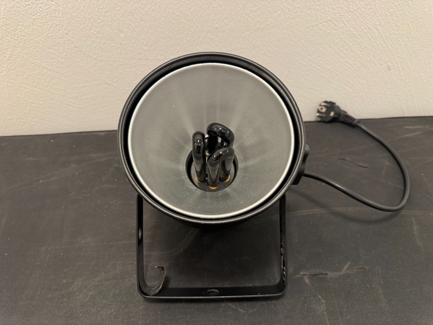 passive Konvektionskühlung ganz ohne Lüfter, mit Schwenk-/Montagebügel, feste Anschlussleitung mit SchuKo-Stecker, gebrauchtes funktionierendes Leuchtmittel