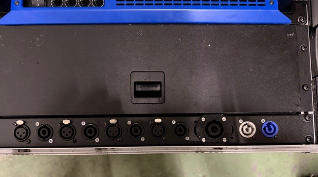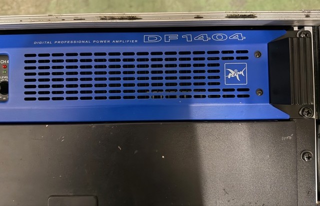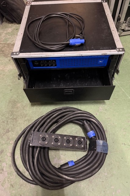 park df1404 audio versterker 4 x 350W bij 8 ohm in case met patchboard waarin 4 x input en aparte output per kanaal of via 10 mtr snake naar 4 voudig aansluitblok om monitoren vooraan podium aan te sluiten