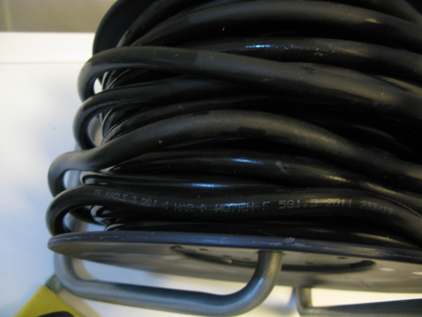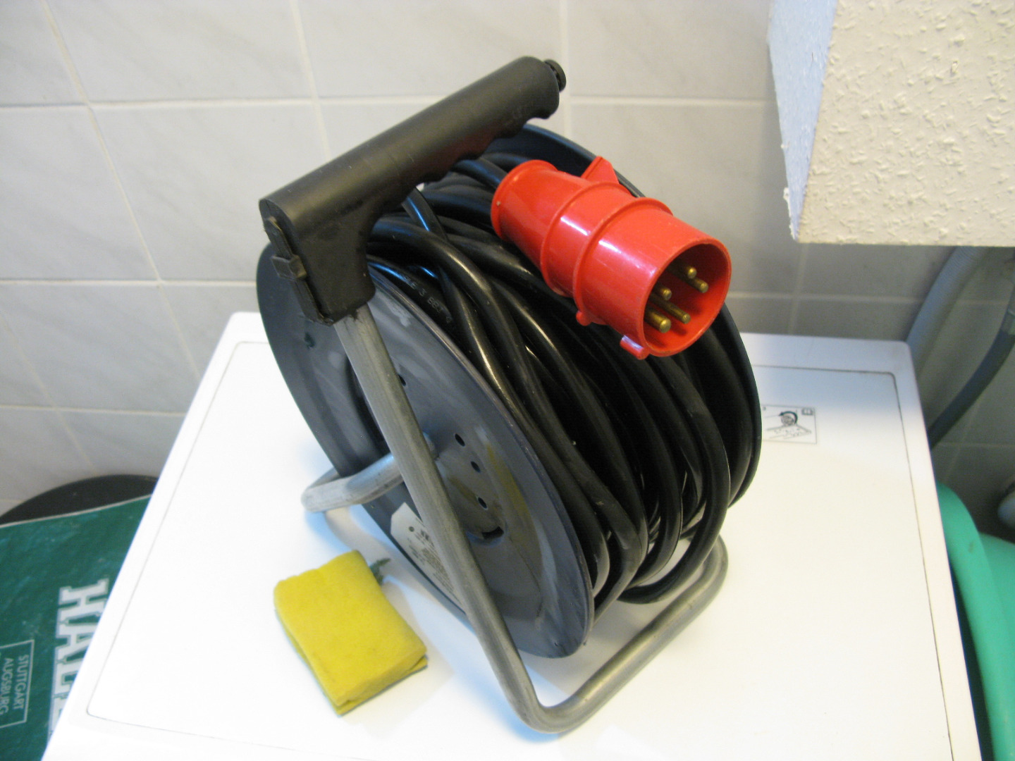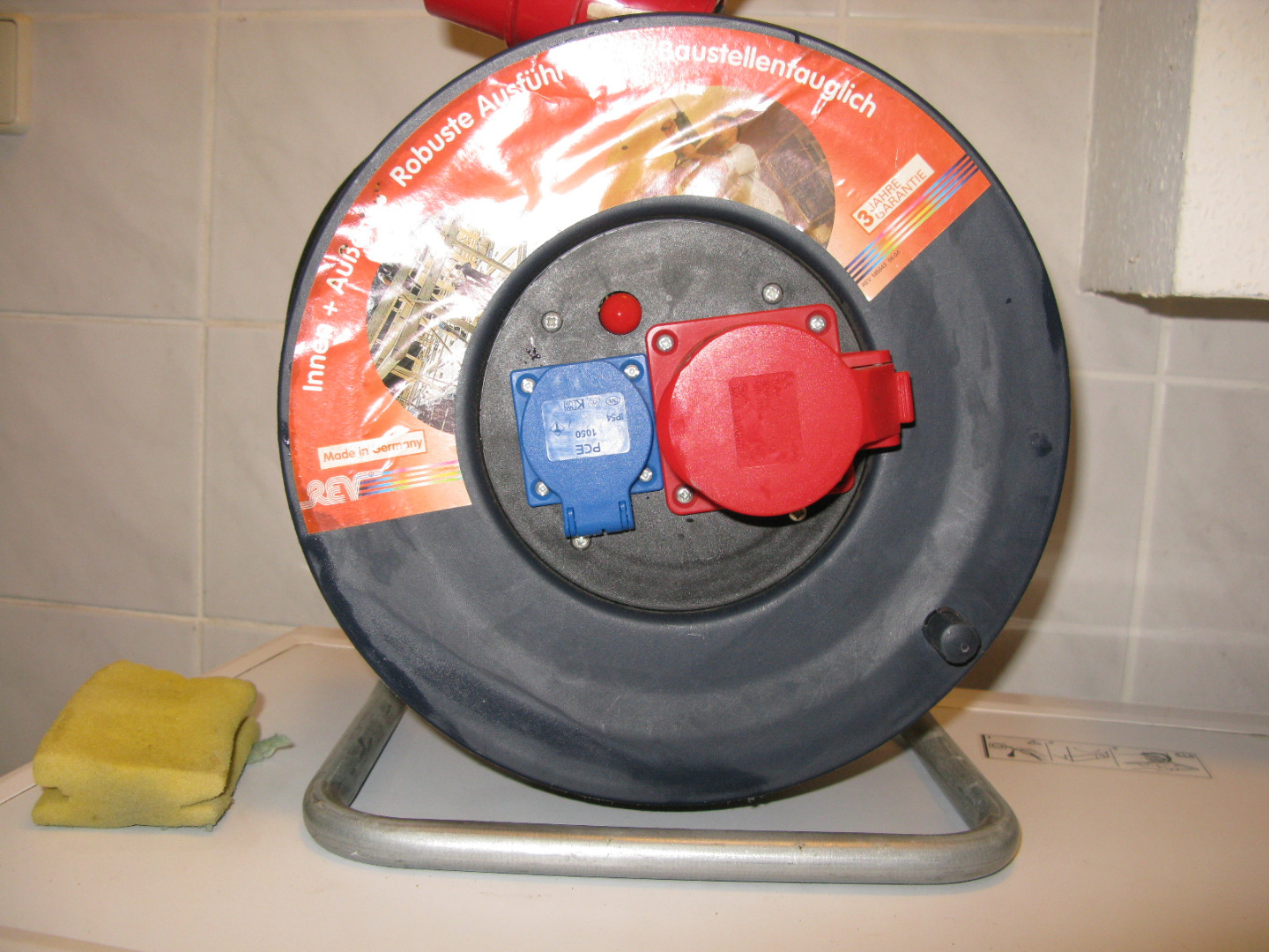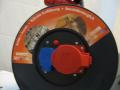 16A CEE rot Stecker auf 16A CEE rot Buchse (an der Trommel) + 1x Schuko 230V mit Deckel.