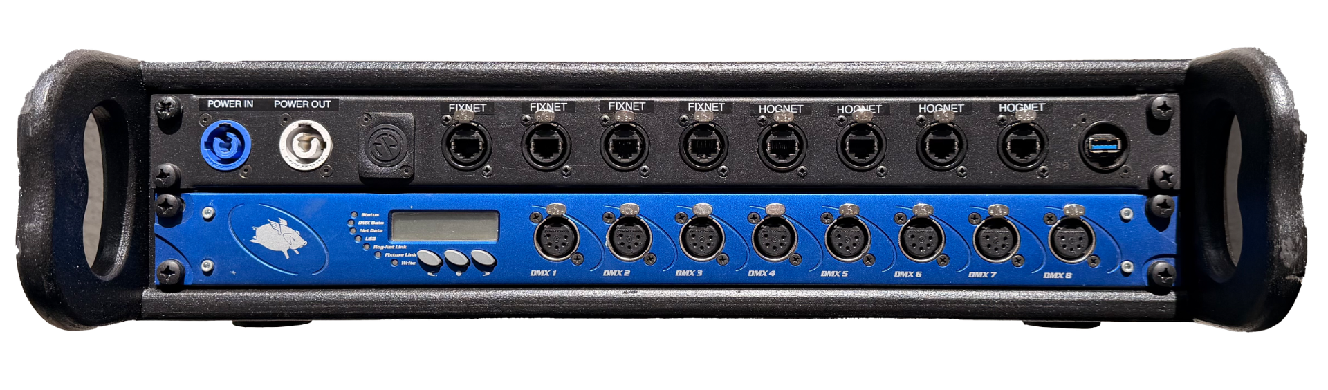 The Hog DMX processor 8000 provides the output power for Hog systems. The Hog Operating System doesn't limit you to a fixed number of DMX channels - just add as many DMX processor 8000s as needed (along with an Ethernet switch) to supply the specified number of DMX universes for the production or installation. With an unprecedented amount of computing power, the DMX Processor 8000 manages 16 DMX universes with ease while expanding the power and reliability of the Wholehog control system as a whole. By providing standard XLR, Art-Net, and E1.3.1 (sACN) output at a steady rate, the possibilities for lighting design are truly endless with the DMX Processor 8000. In tandem with Hog 4OS products, the DMX Processor 8000 now supports timecode input. Up to 8 USB MIDI/LTC widgets can be plugged into the DP8000. Each input is considered an “index” and can be used to bring up to 8 unique timecode clocks into the Hog 4OS control system through the DP8000.