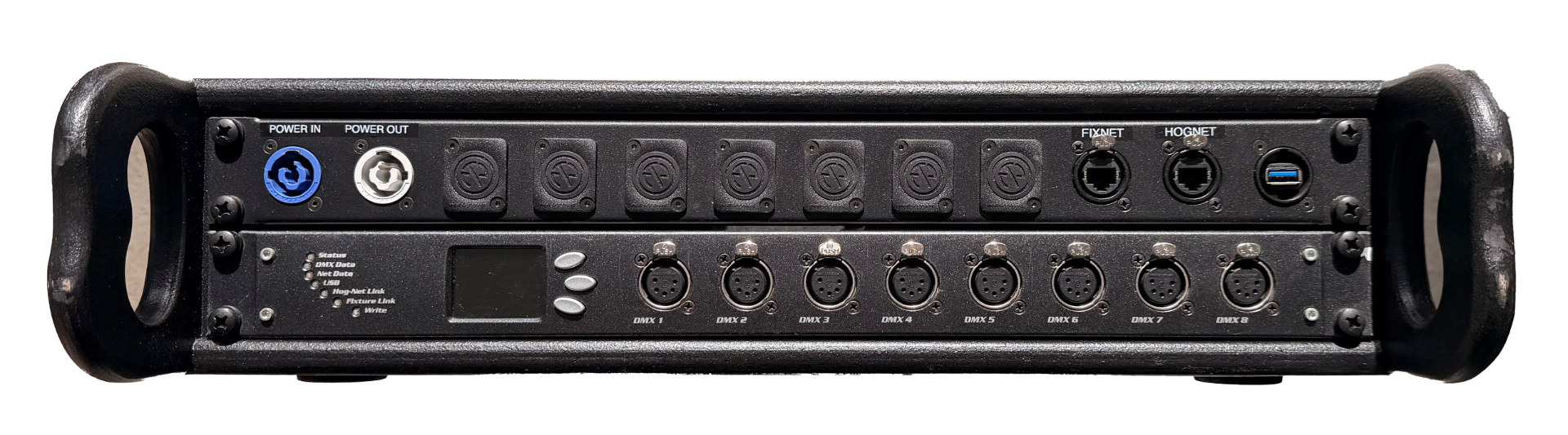 The Hog DMX processor 8000 provides the output power for Hog systems. The Hog Operating System doesn't limit you to a fixed number of DMX channels - just add as many DMX processor 8000s as needed (along with an Ethernet switch) to supply the specified number of DMX universes for the production or installation. With an unprecedented amount of computing power, the DMX Processor 8000 manages 16 DMX universes with ease while expanding the power and reliability of the Wholehog control system as a whole. By providing standard XLR, Art-Net, and E1.3.1 (sACN) output at a steady rate, the possibilities for lighting design are truly endless with the DMX Processor 8000. In tandem with Hog 4OS products, the DMX Processor 8000 now supports timecode input. Up to 8 USB MIDI/LTC widgets can be plugged into the DP8000. Each input is considered an “index” and can be used to bring up to 8 unique timecode clocks into the Hog 4OS control system through the DP8000.