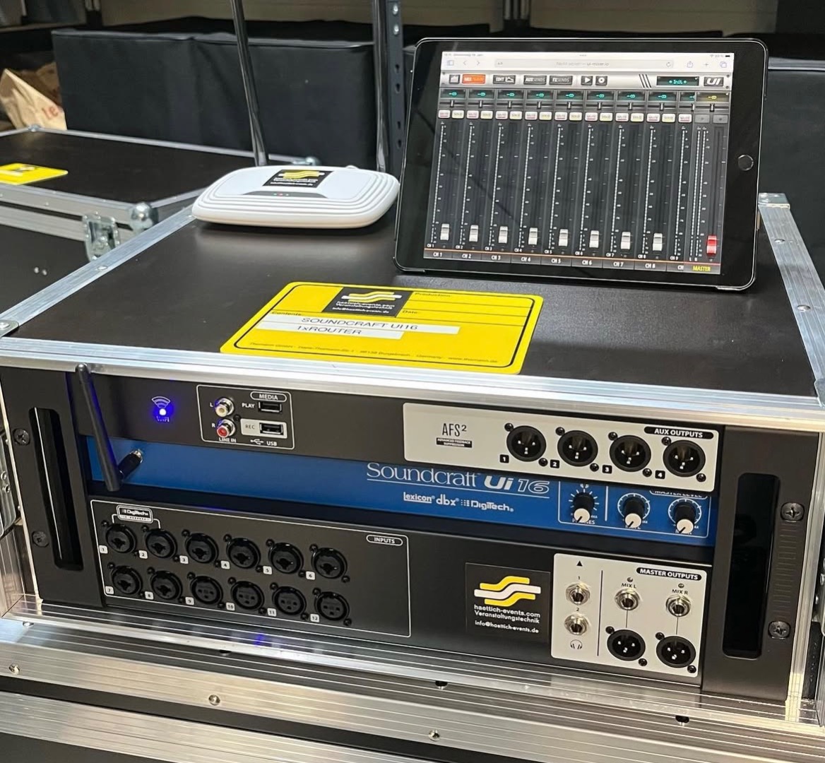 Zum Verkauf kommt ein Soundcraft Ui16 Digitalmischpult inkl. Apple IPad und Router im Rack.