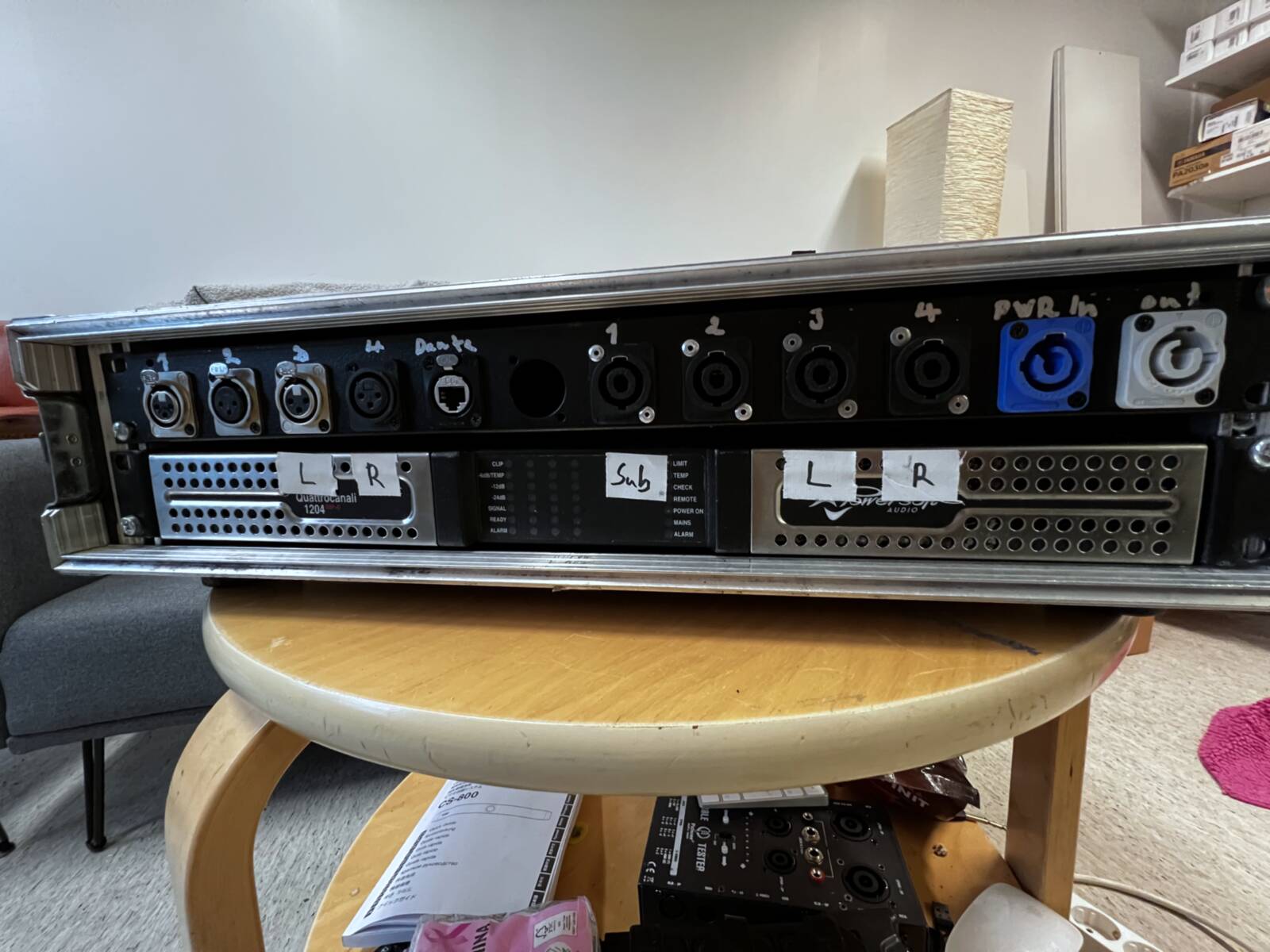 Power amplifier installed in a 2U rack with connector panel, suitable for touring applications. Features tailored speakon connections for Nexo PS-series speakers and a dedicated bridged connector for subwoofer use. Ideal for professional sound setups requiring reliable install amps with practical connectivity options.