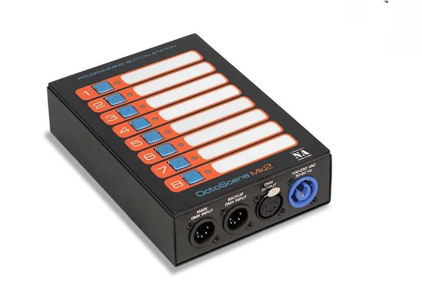 OctoScene Mk2 from Company NA is a standalone DMX signal recorder which can be used as a DMX signal backup storage. This device works in one DMX universe and it is possible to record and play back up to 8 dynamic scenes with variable DMX values. Recorder has two DMX signal inputs: One priority which overrides the OctoScene ( DMX signal from a console), and the second (IN-2) used only for programming the recorder. Input (IN-1) also functions as a DMX Through. In the event of data loss the OctoScene Mk2 can be set to playback any of the pre-recorded scenes. Ideal for medium-size touring or permanent installations.