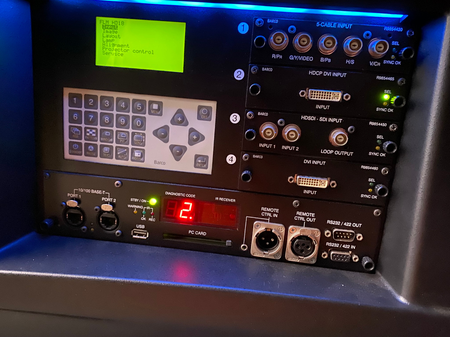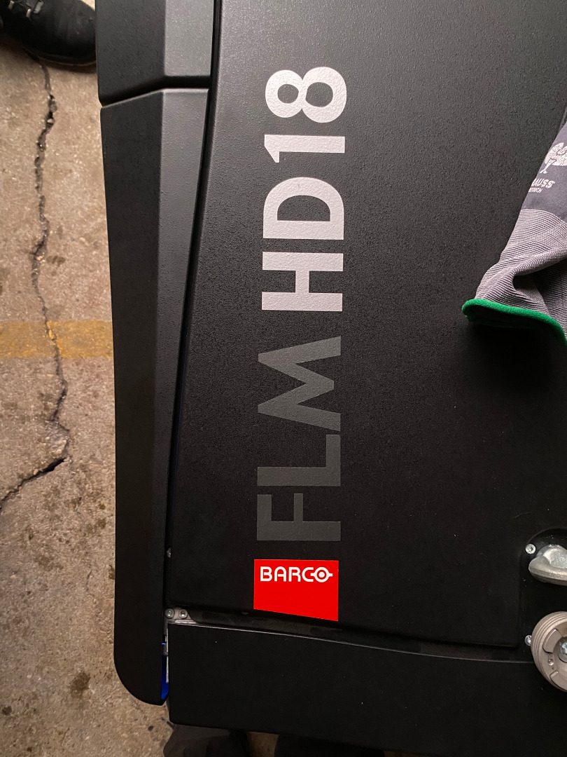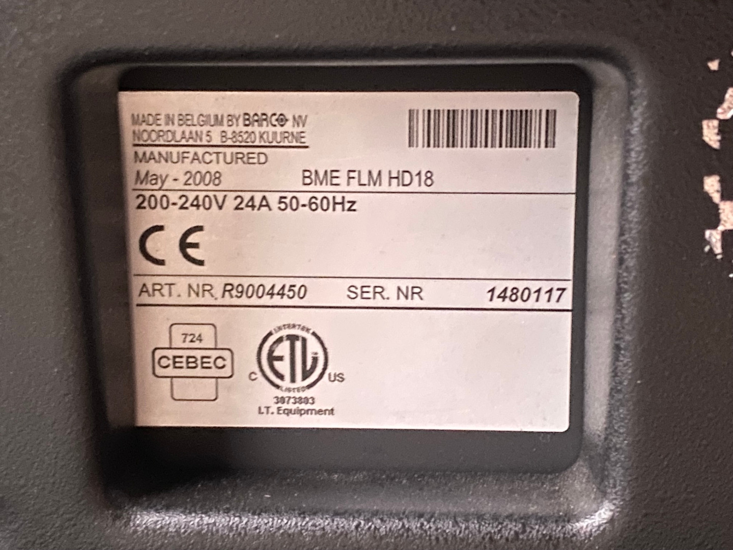 zum Verkauf steht ein Barco FLM HD18 Projektor mit Flugrahmen im Case.
