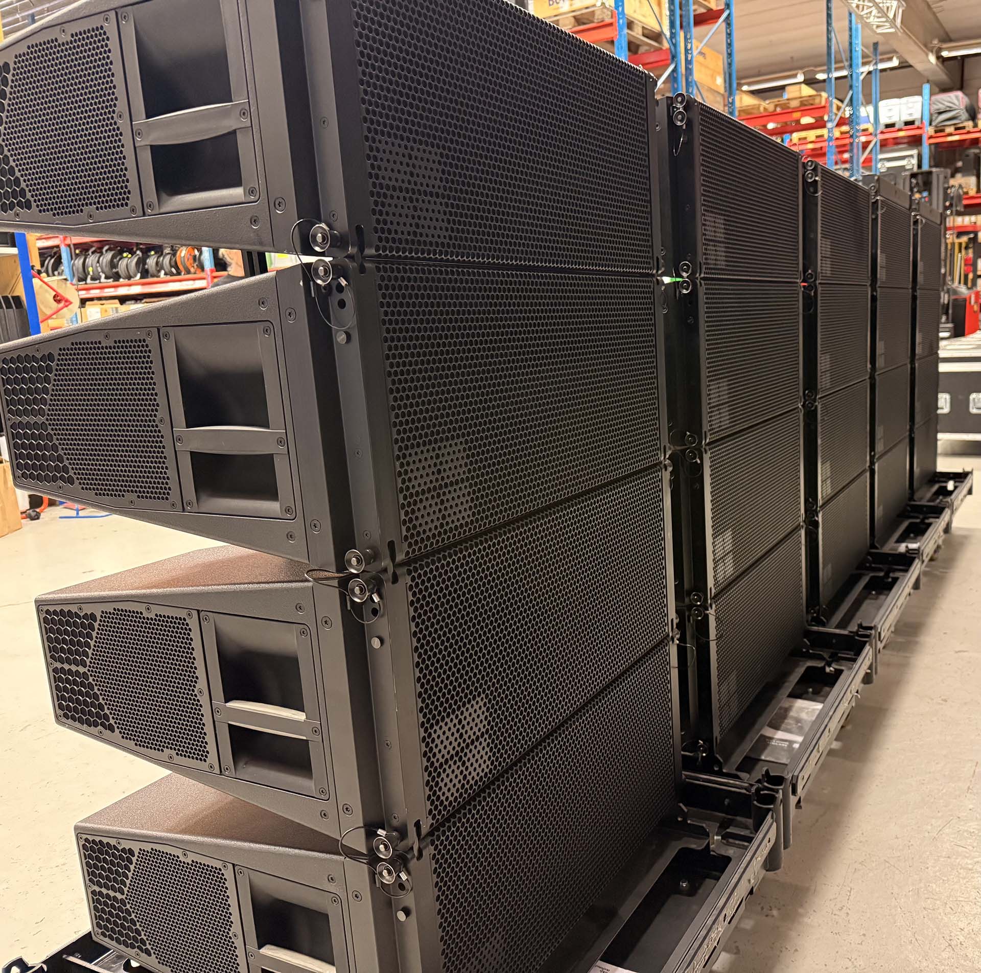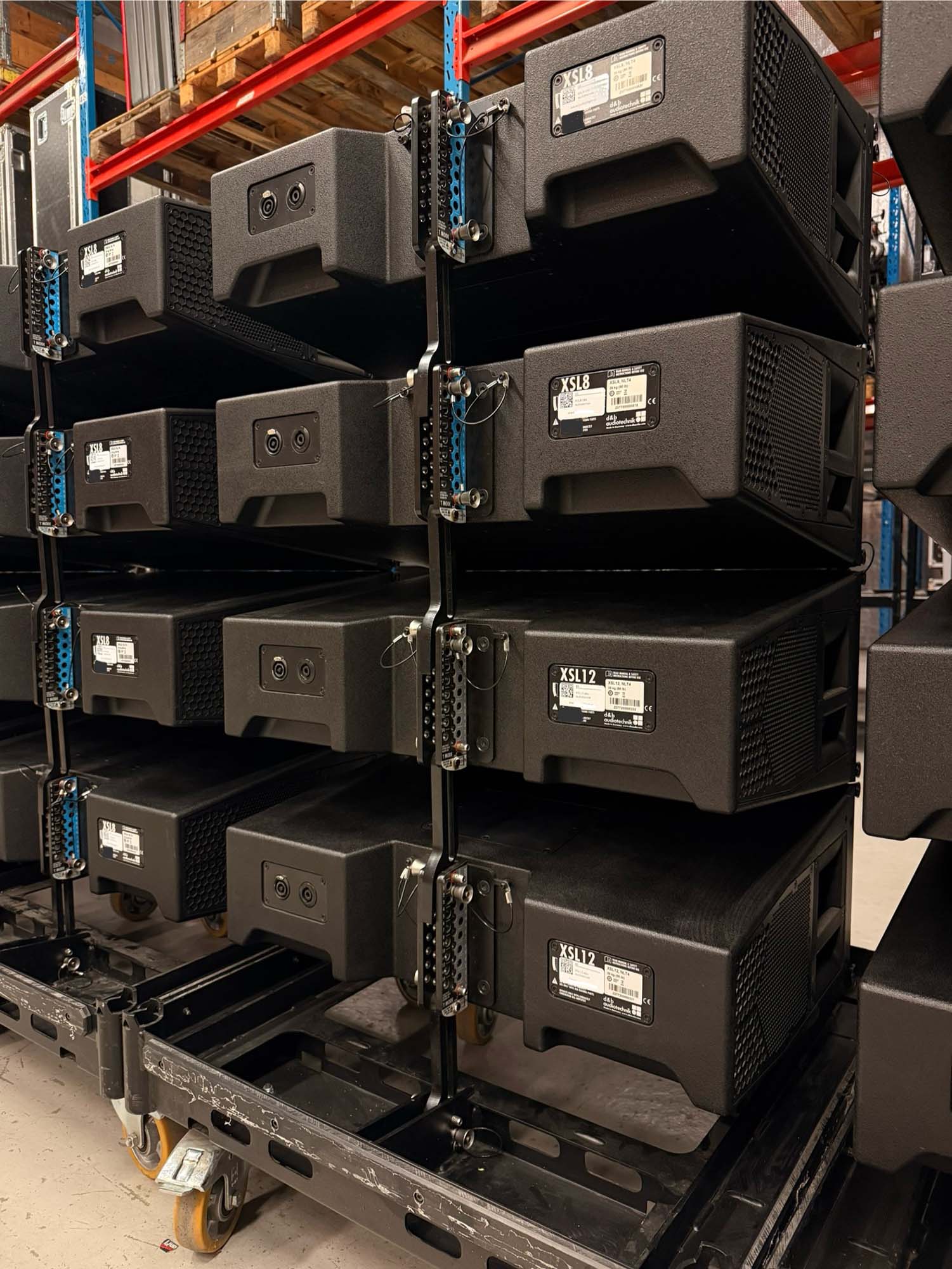 Comprehensive set comprising 20 XSL8 loudspeakers, 4 XSL12 loudspeakers, 5 XSL8 touring carts, 1 XSL12 touring cart, 2 XSL Top Mounting frames with laser, and 2 XLS Flying Frames with laser, suitable for professional audio applications and touring use.