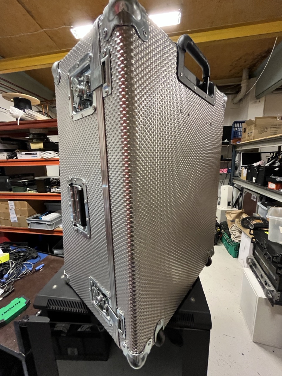 Empty flight case designed for transport and protection of equipment, offering secure storage and durability for professional use.