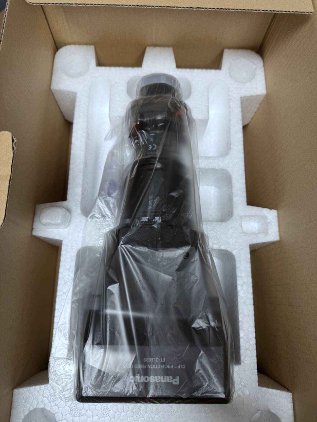 Ultra short throw lens designed for Panasonic 1-chip DLP projectors, offering a throw ratio of 0.38:1 with WUXGA, 0.40:1 with WXGA, and 0.39:1 with XGA projectors. Supplied in original packaging.