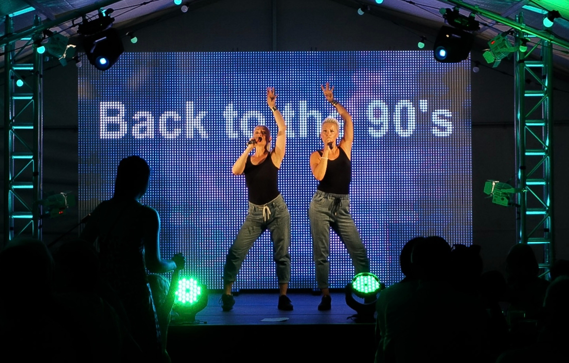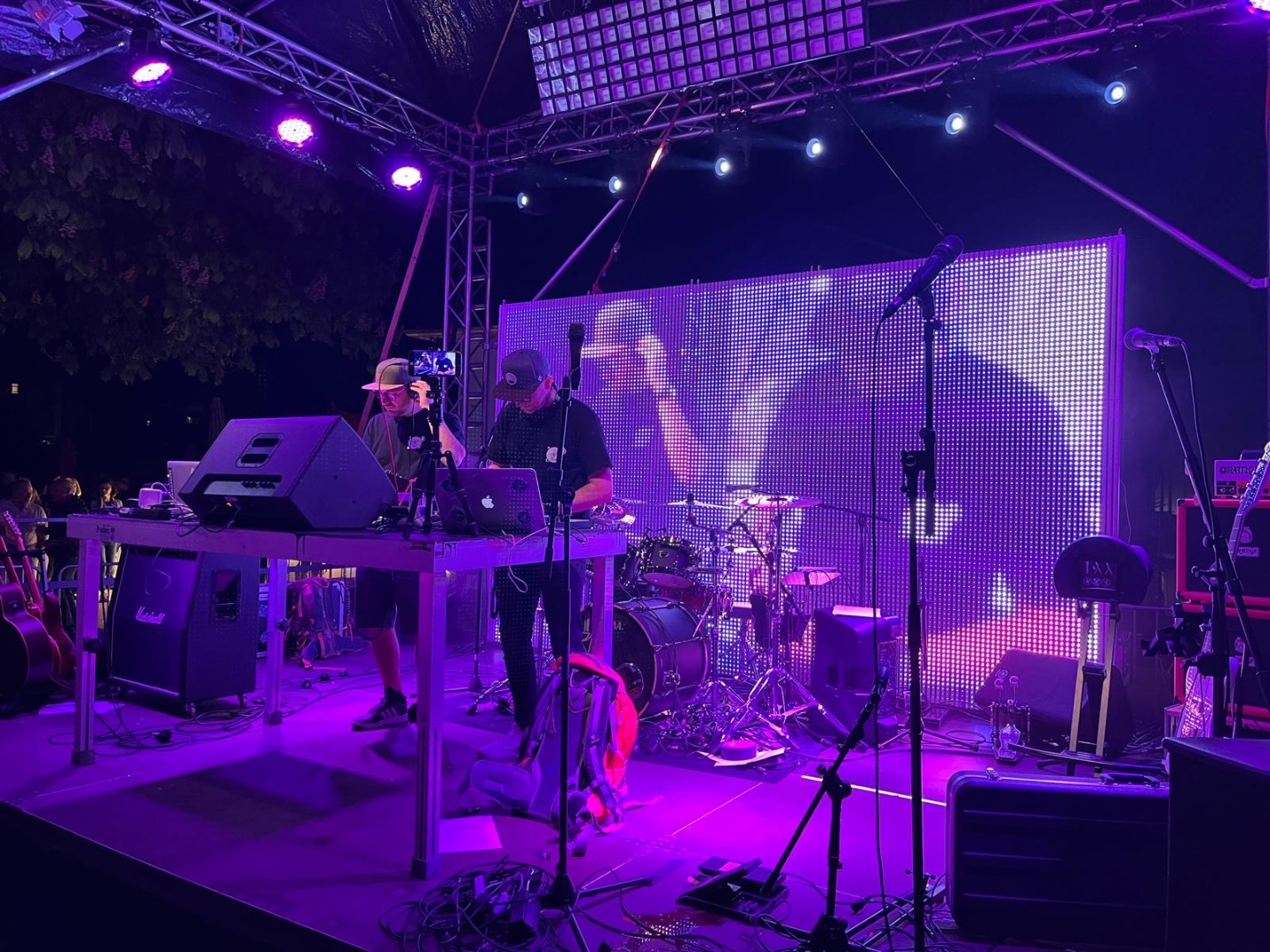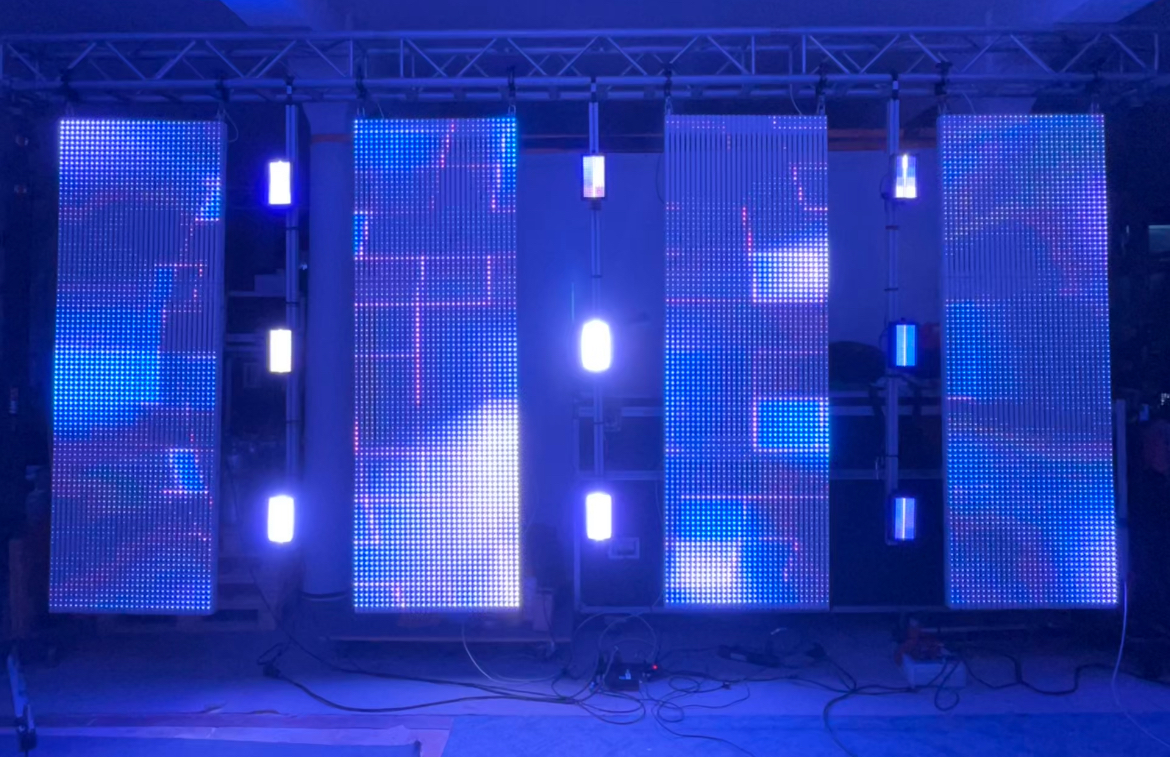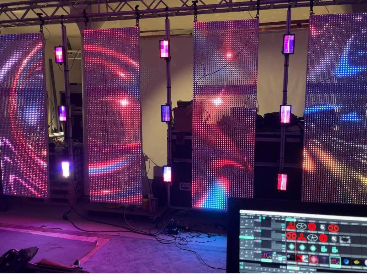 Diese LED Mesh-Wand eignet sich perfekt als Bühnenrückwand. Wir haben darauf komplette Background-Videos abgespielt oder die Wand für Videoeffekte genutzt. Wir haben sie anfangs mit VDJ (Musikvideos und Shader-Plugins) und später mit Resolume bespielt.