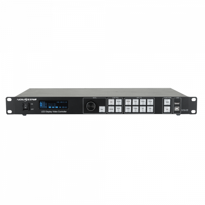 Für die anspruchsvollsten Benutzer, die nach einer All-in-one-Lösung für die Einrichtung Ihres LED-Screens mit Nova Steuerungssystem suchen, ist der VX4S das perfekte Werkzeug. Durch das leistungsstarke Front-End-Processing ist kein externer Scaler nötig. Der VX4S bietet Funktionen wie Bild-in-Bild (Position und Größe können angepasst werden), einen HDMI-Ein- und Ausgang und eine Farbkorrektur. Die Eingänge können mit den Direktauswahltasten auf der Vorderseite ganz einfach ausgewählt werden und die gut lesbaren LCD-Displays ermöglichen die Navigation durch die intuitiven Menüs.