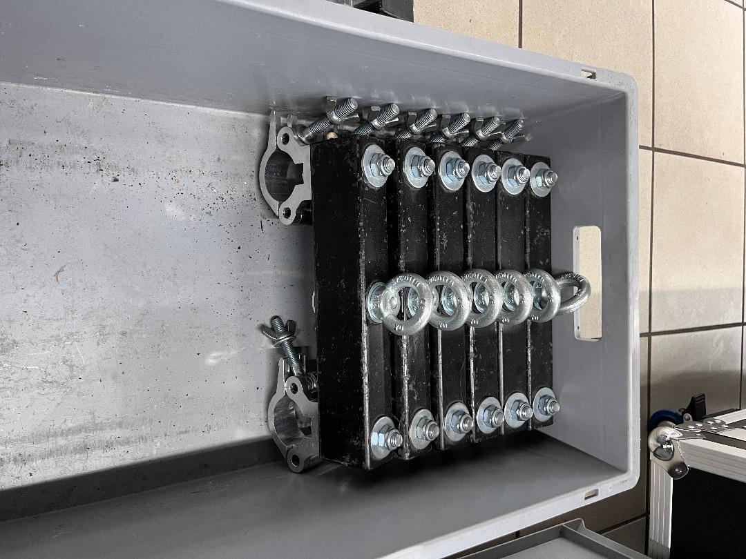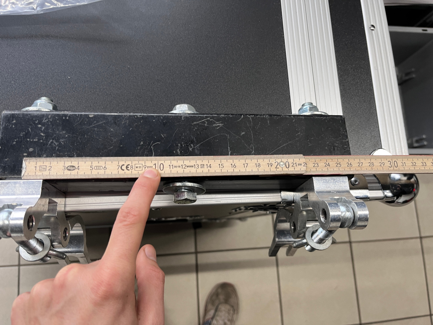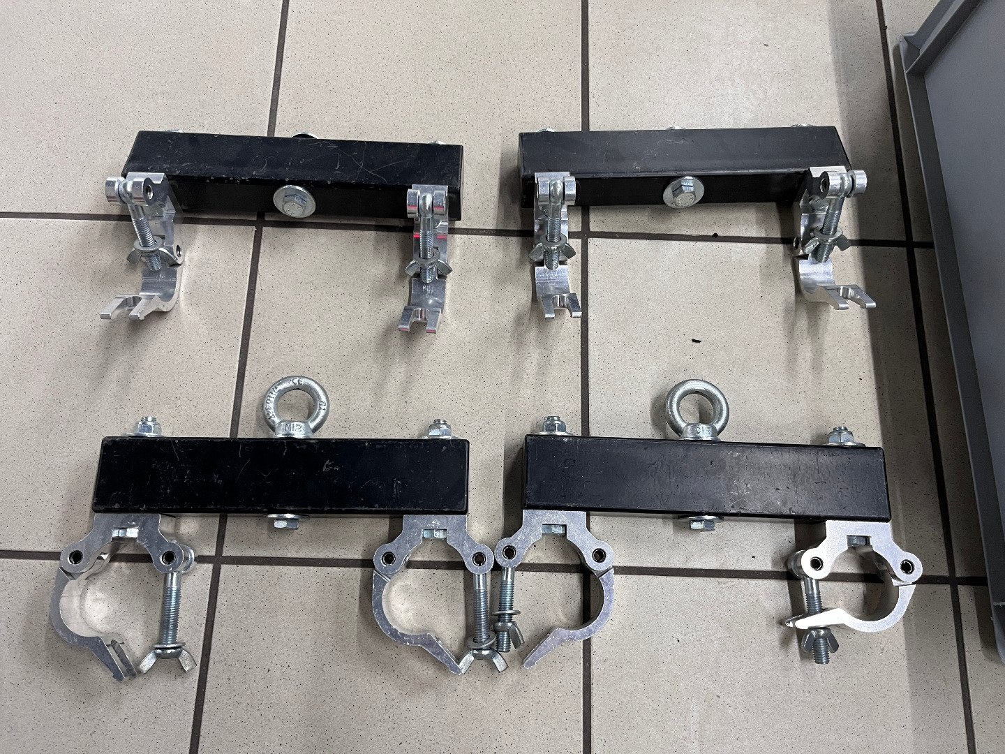 Wir verkaufen 10x Gizmo Truss-Adapter, in einem anderen Inserat auch Alu-Rohre die passend wären. Schellen sind alle in einem guten Zustand und vollständig. Bei 2 Trägern ist oben keine Öse sondern eine Mutter montiert. Die Schellen passen für Rohre mit 50mm Durchmesser. Die Länge der Träger ist 29cm und der Abstand mitte Schelle bis mitte Schelle ist 24cm.